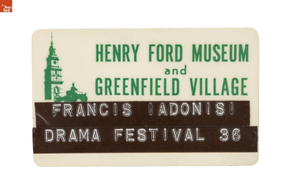 Henry Ford Museum and Greenfield Village American Drama Festival Name Badge, Used by Frances (Iadonisi) McCans, 1970