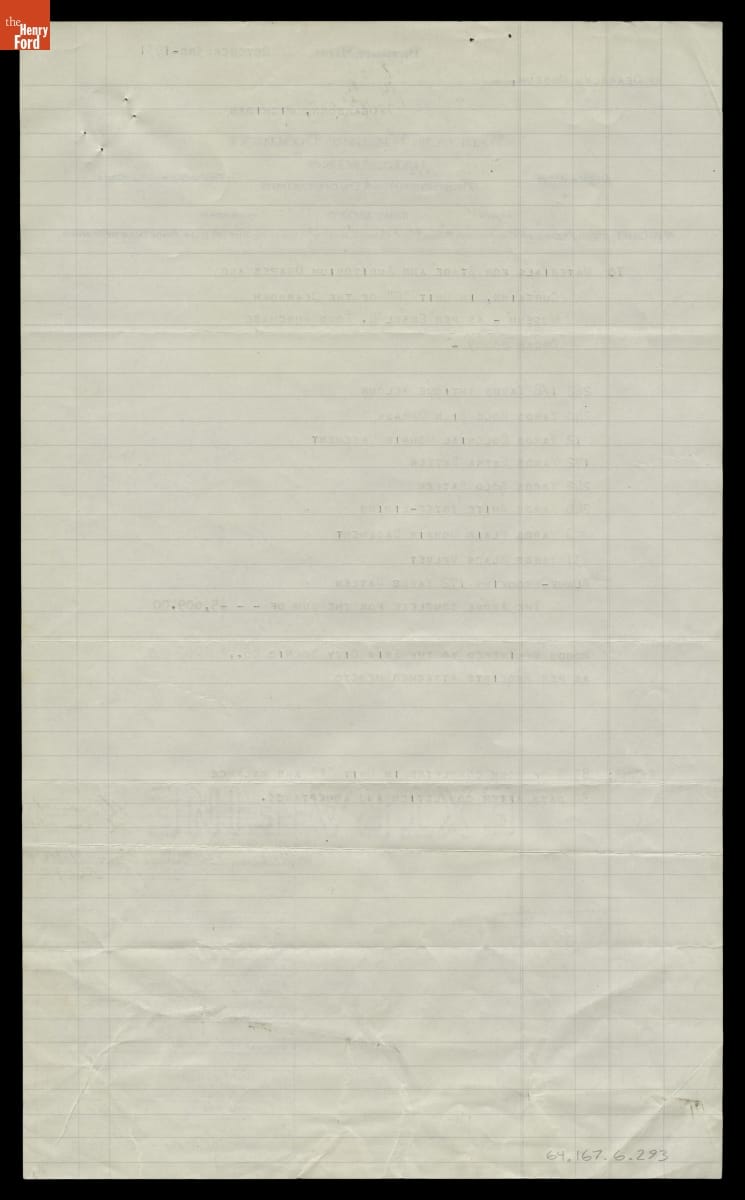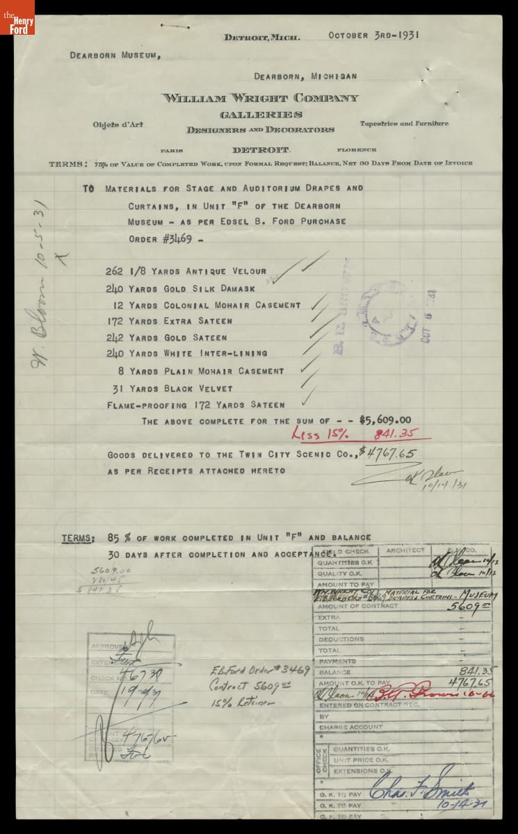 Invoice for Stage and Auditorium Drapes and Curtains for Henry Ford Museum Theater, October 1931