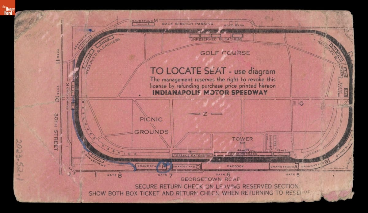 A.J. Foyt won the second of his four Indianapolis 500 victories in 1964, but that year's race is better remembered for a fiery crash during the second lap that killed drivers Dave MacDonald and Eddie Sachs. It happened as the cars came out of turn four onto the front straightaway. This ticket was for a seat near the accident scene.