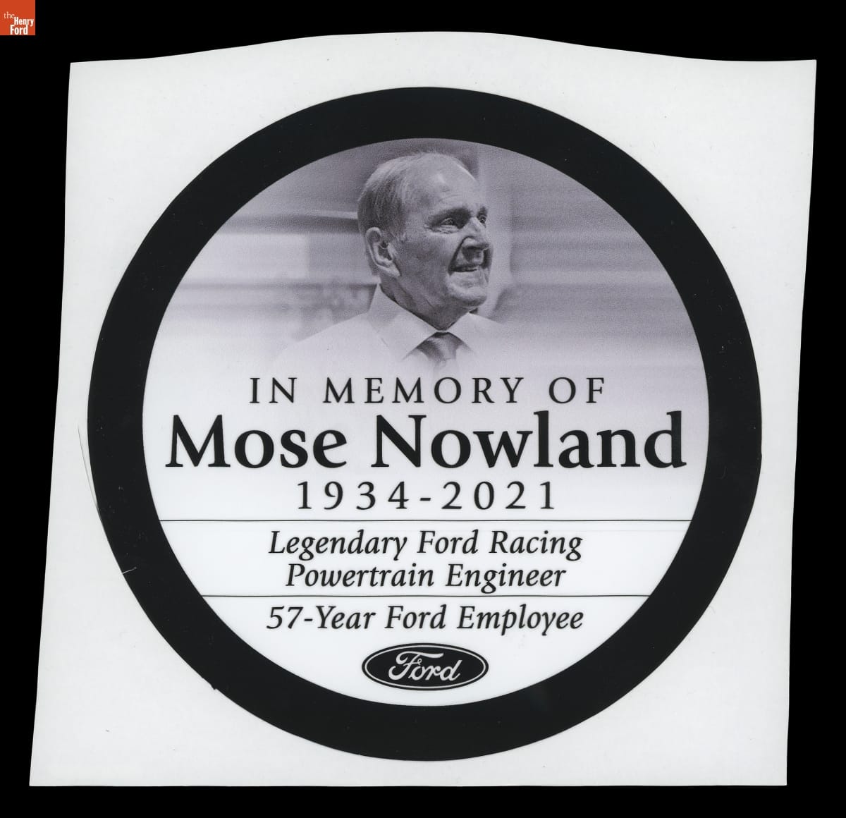 Mose Nowland spent 57 years with Ford Motor Company, most of them building engines for its racing program. After retiring in 2012, Nowland volunteered in The Henry Ford's Conservation Department, where he cared for engines and race cars that he had helped build. Following Nowland's death in 2021, Ford honored him with decals on its NASCAR and NHRA competition cars.