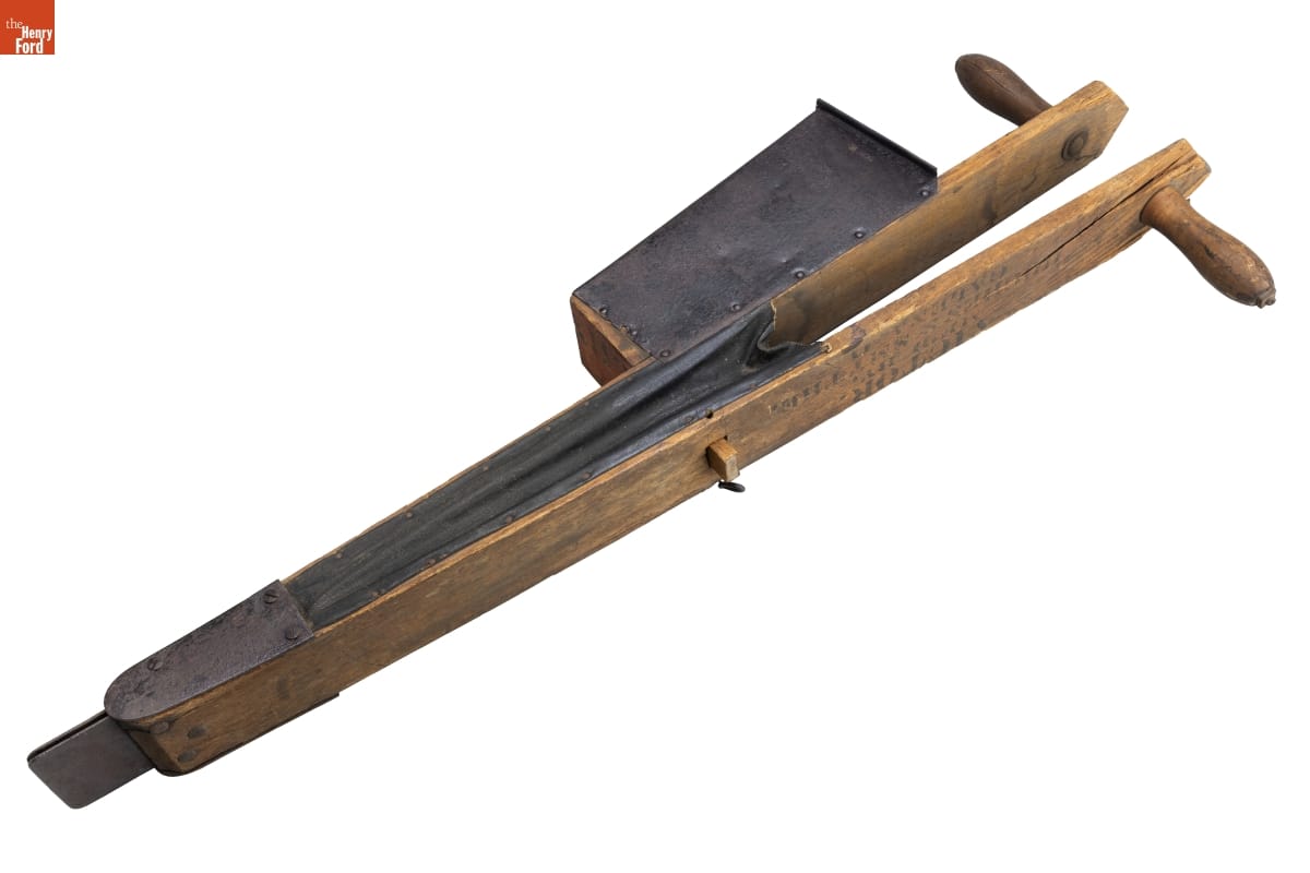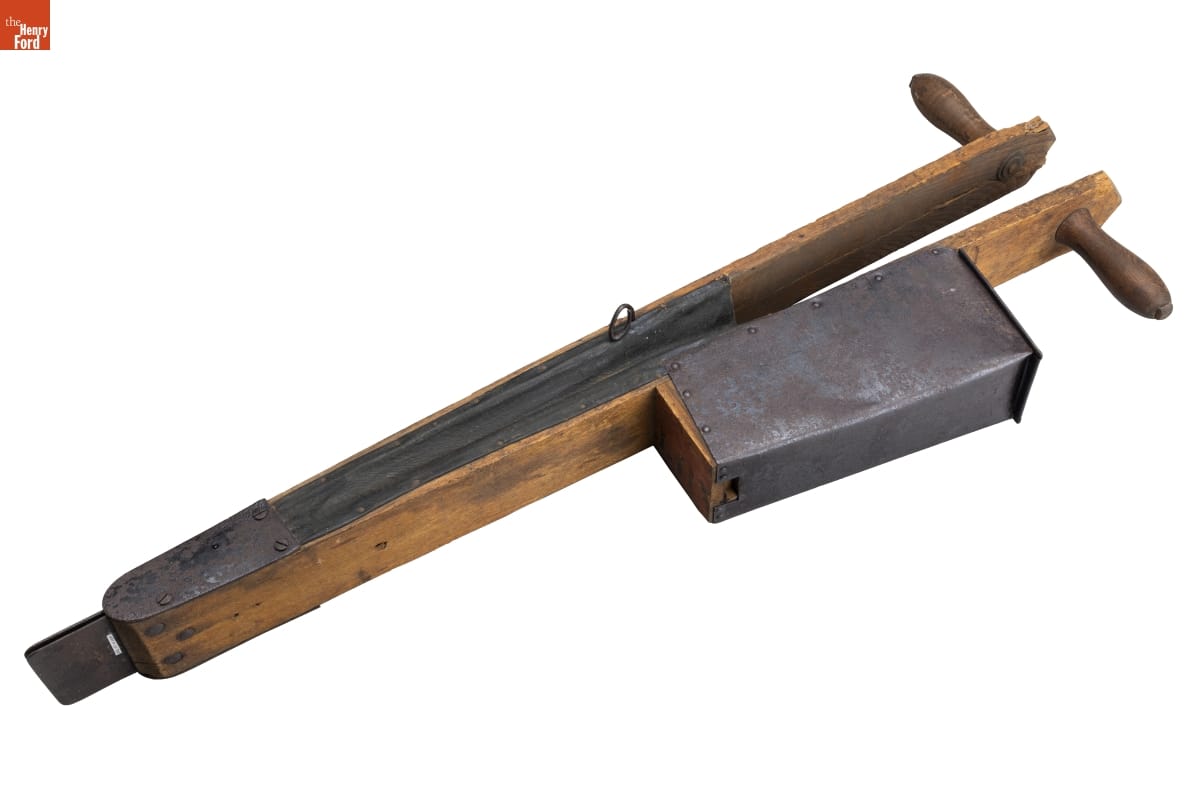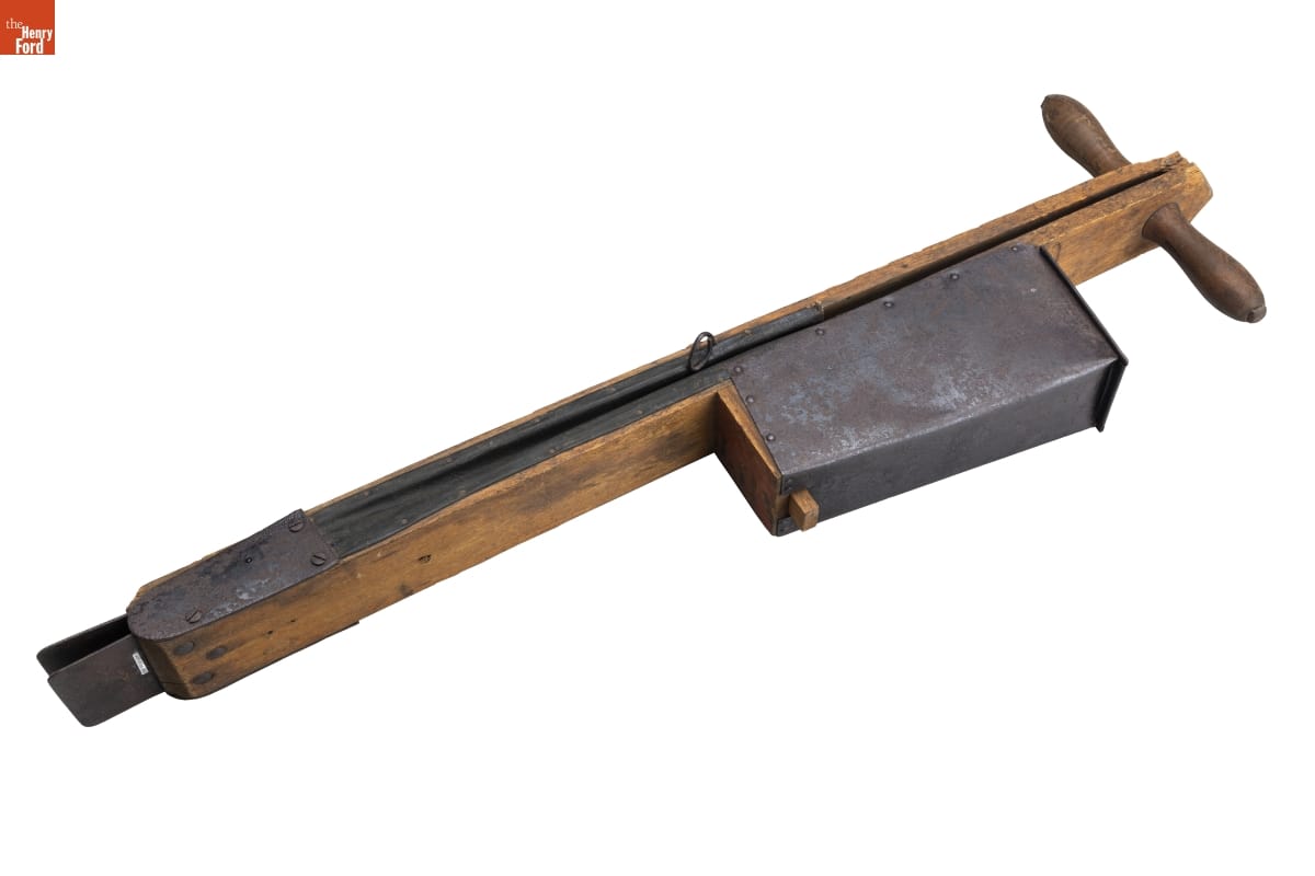 Beginning in the 1850s, farmers could plant corn by jabbing the metal tip of this planter into the ground. Activating the lever would drop the seeds into the hole. This device may have sped up planting, but it remained a tool for small acreage farms or planting areas missed by horse-drawn mechanical seed drills.