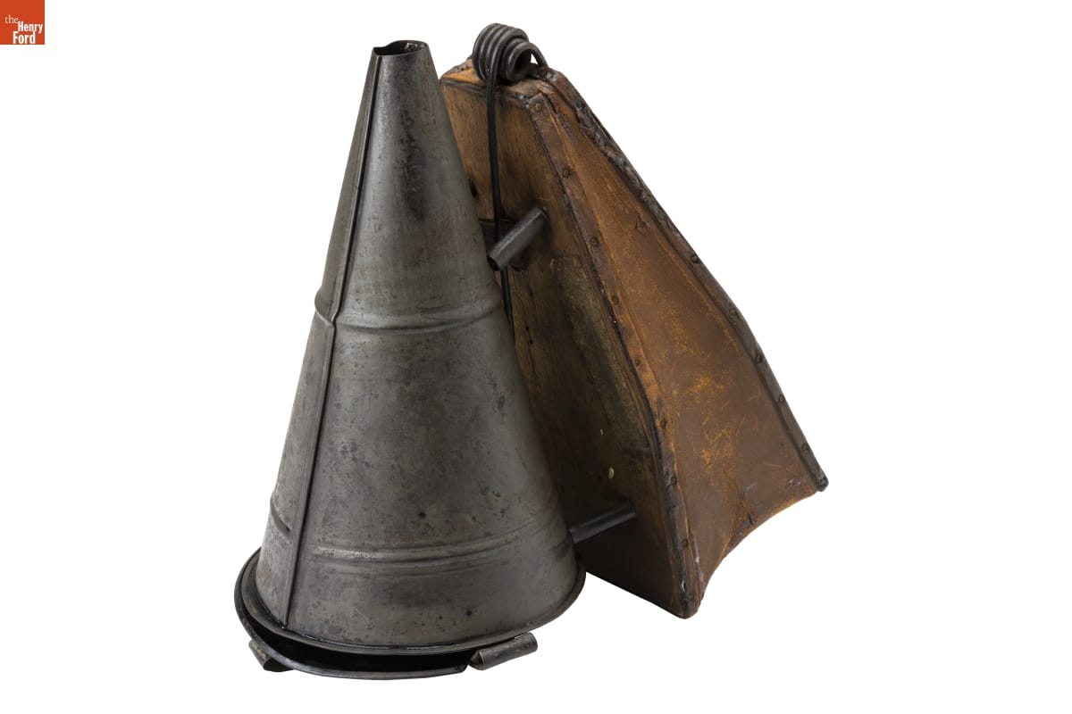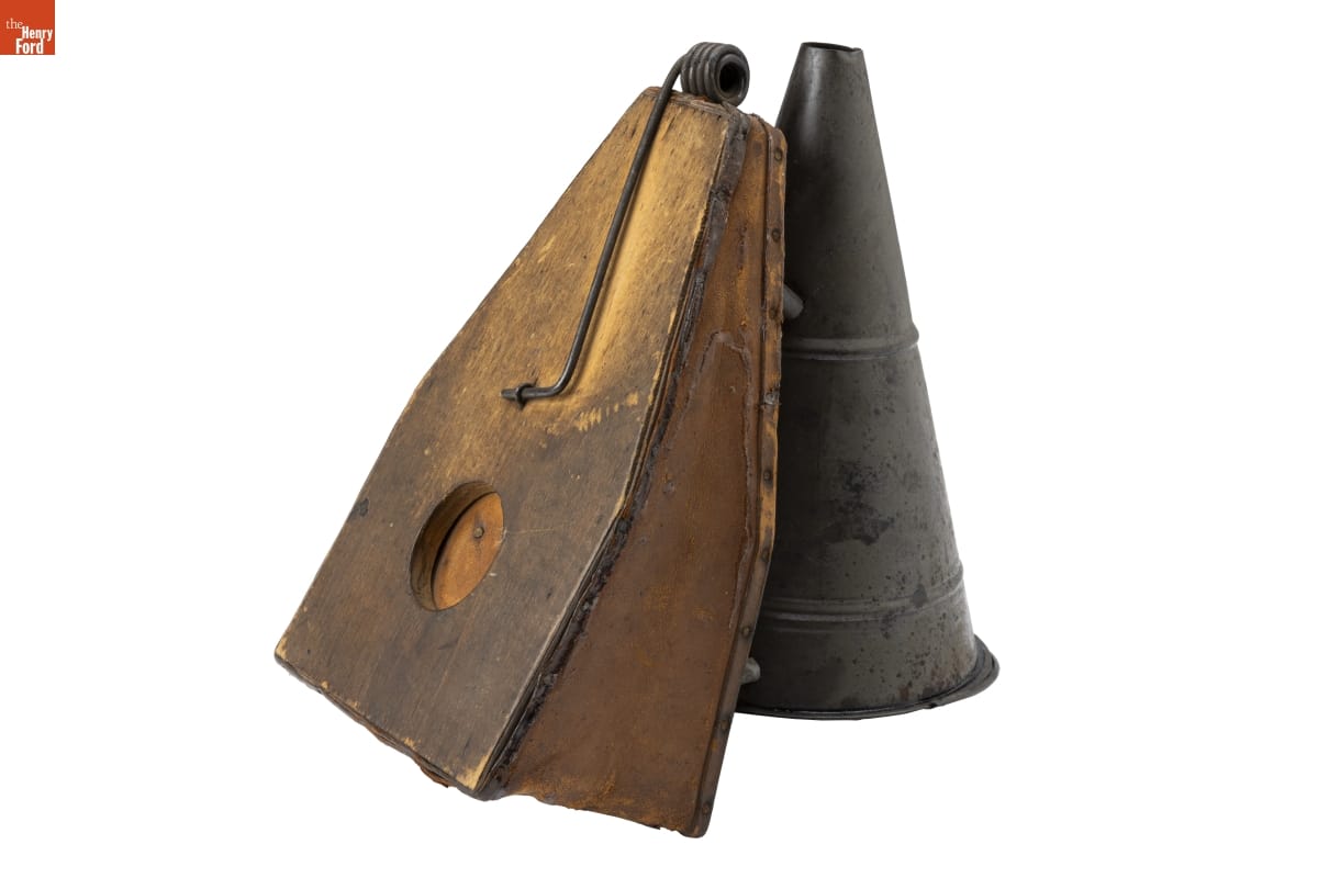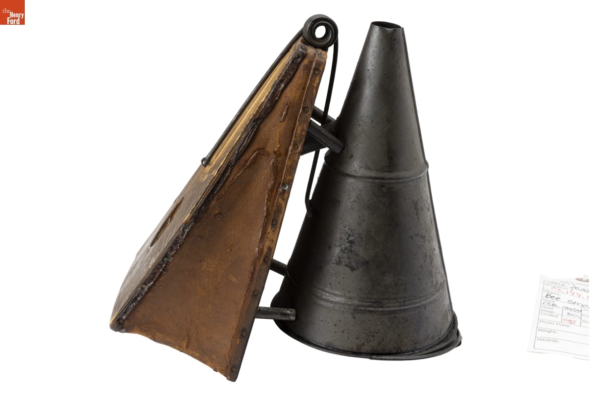 Beekeepers always have a smoker near when they open hives. The smoker masks the "danger" pheromone that bees emit when threatened which slows the colony's response. The smoke also simulates fire which prompts bees to eat honey in preparation for rebuilding a destroyed hive. This smoker's spout channeled smoke into the hive without the risk of dropping the fuel source into the hive.