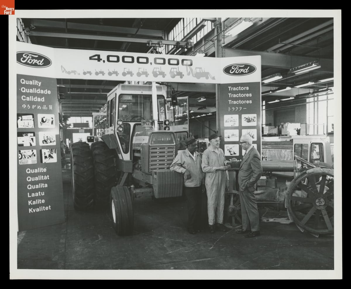 Employees with the 4,000,000th Ford Tractor and a Fordson Tractor at the Highland Park Plant, 1972