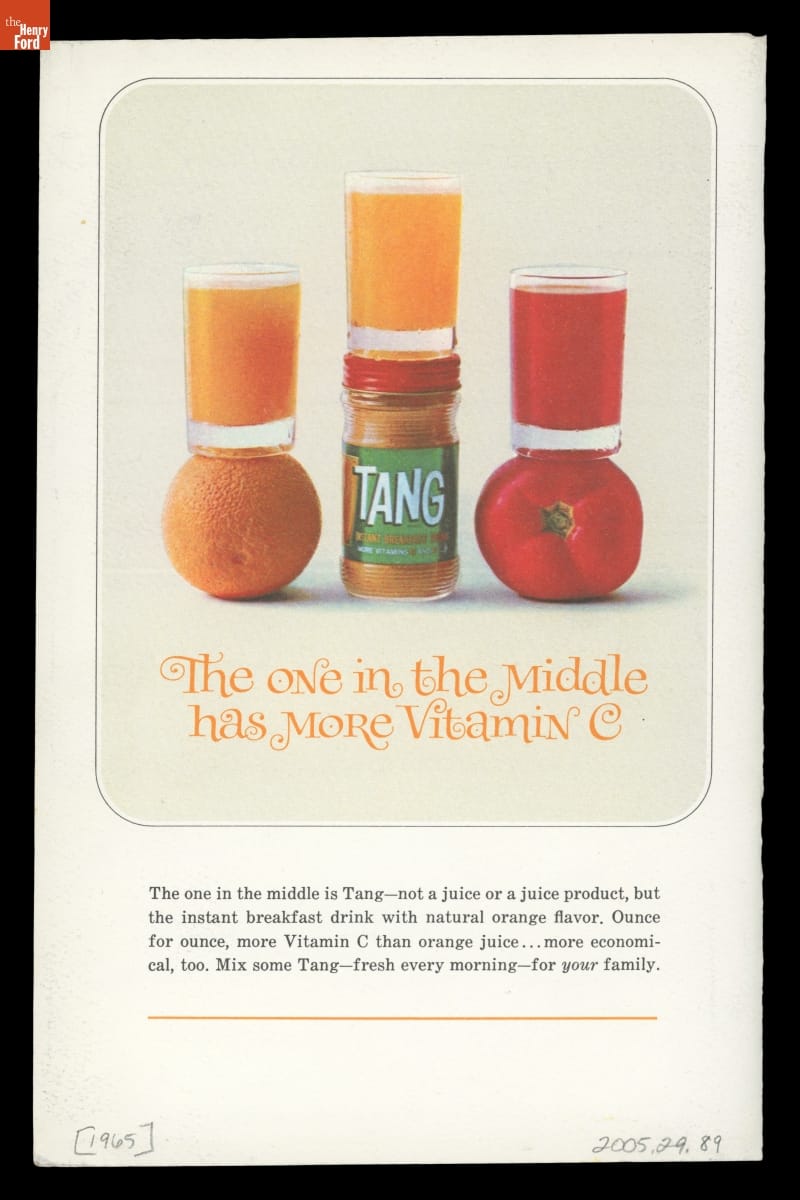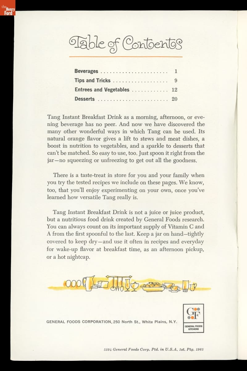 General Foods Corporation marketed Tang, a fruit flavored powdered drink, in 1959. Sales were poor until NASA selected it for use on John Glenn's 1962 Mercury flight, and General Foods Corporation began advertising the space connection. This recipe booklet demonstrates another marketing tactic -- advertising the numerous ways that Tang could be used besides being a beverage.