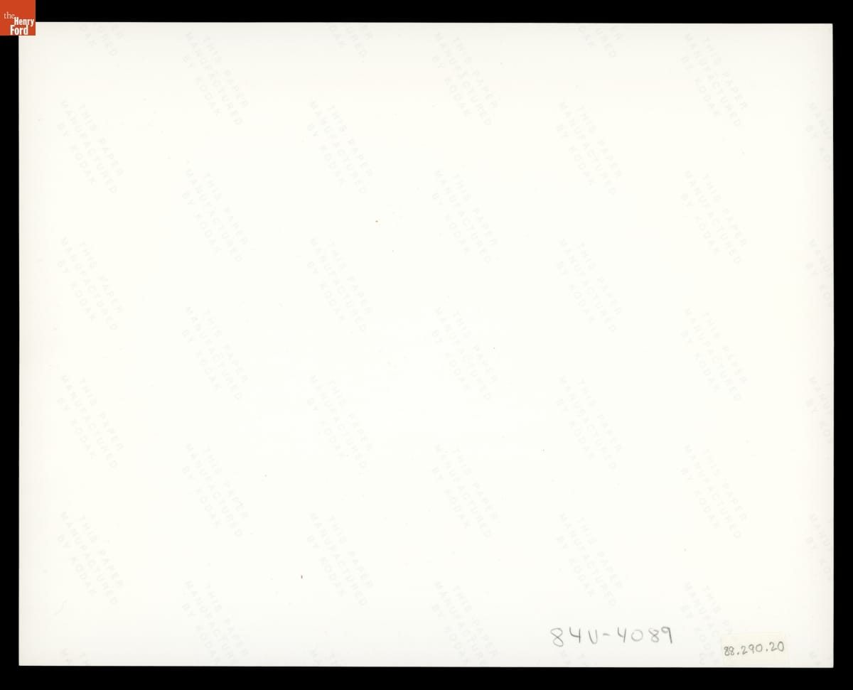 Man Driving a Ford Lawn Mower outside a House, 1984