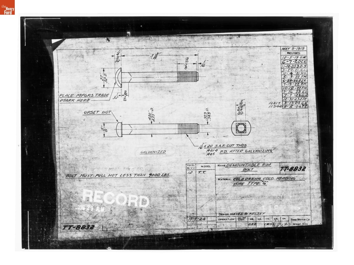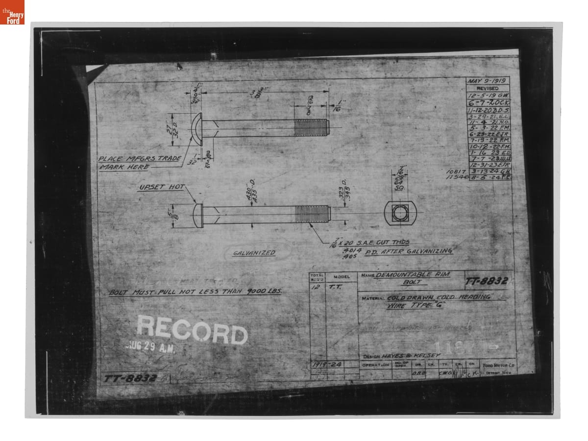 Drawing, "Demountable Rim Bolt," Ford Model TT Truck, August 5, 1924