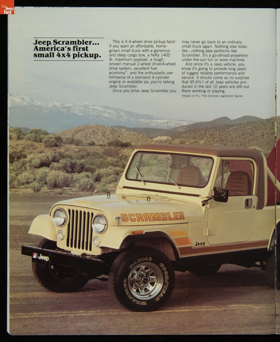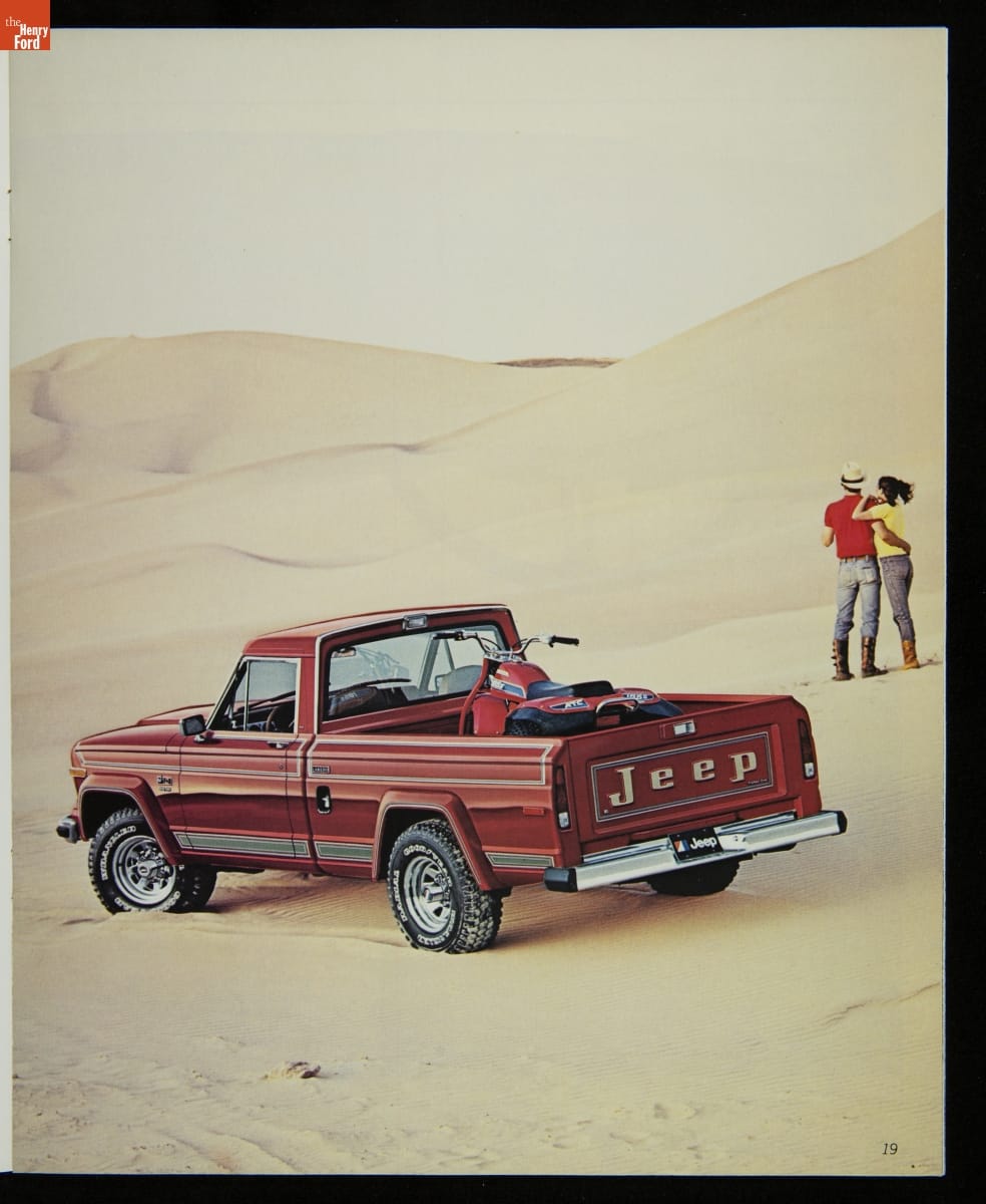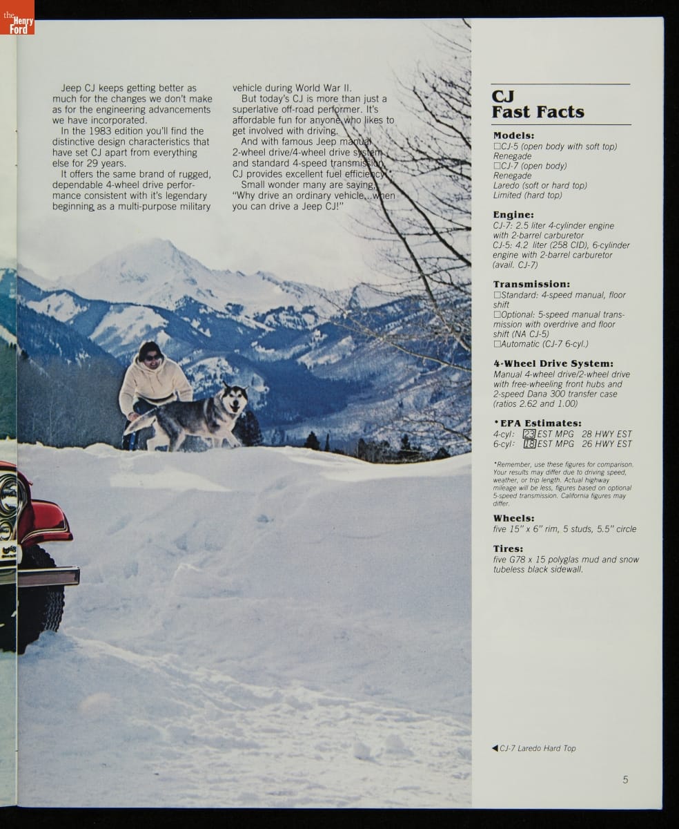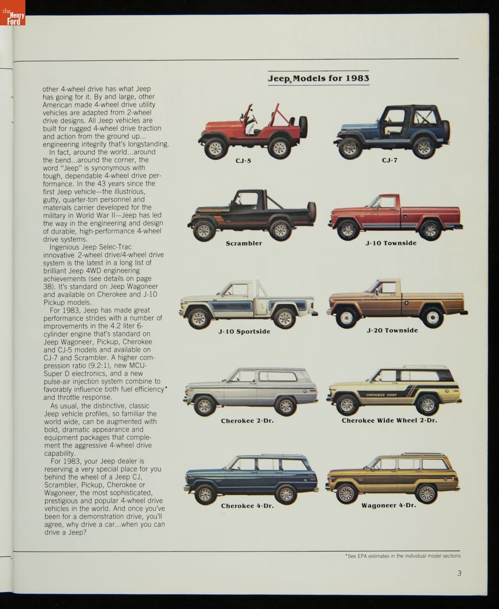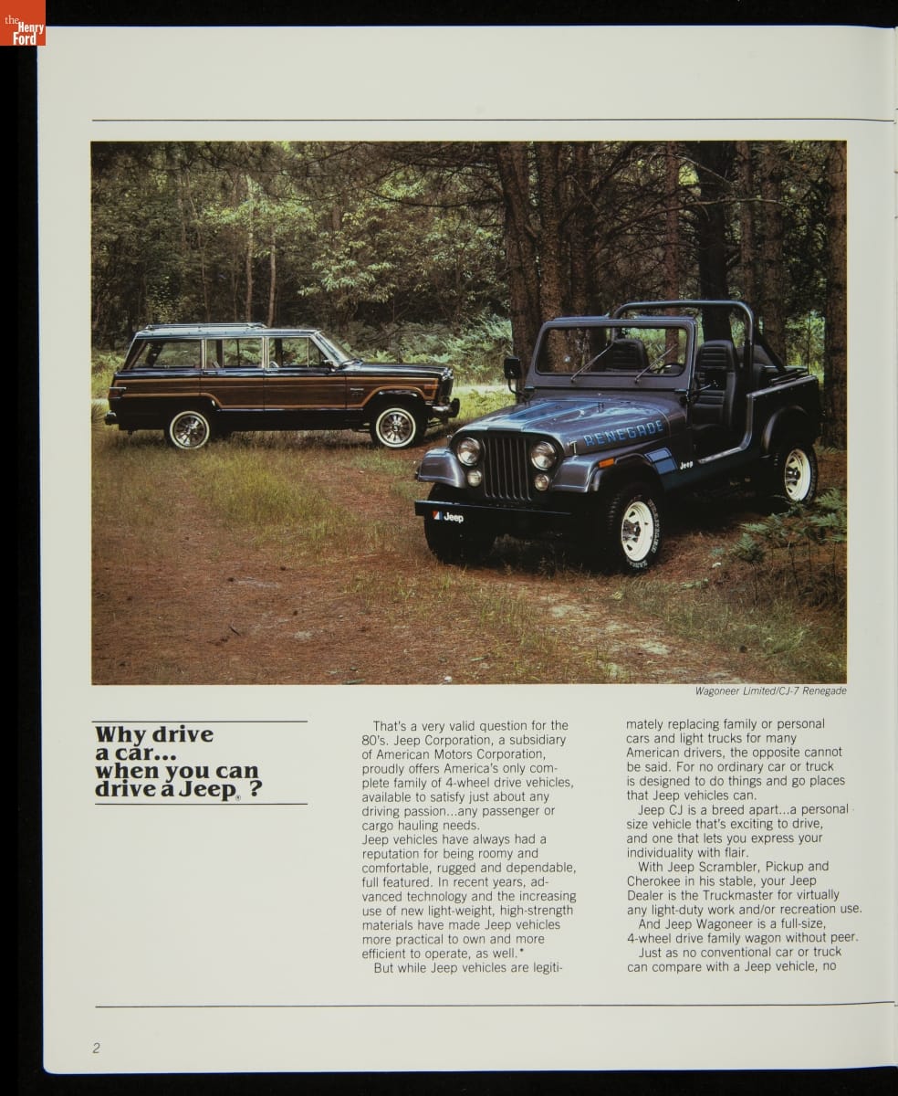 AMC's Jeep brand distinguished itself from the competition in this 1983 brochure. Jeep's pickups, wagons, and SUVs projected a rugged, off-road image. But by 1983, even the CJ-7 -- a direct descendant of the original military jeep -- was roomy and practical enough to serve as a family car. Jeep sold more than 113,000 vehicles worldwide in the 1983 calendar year.