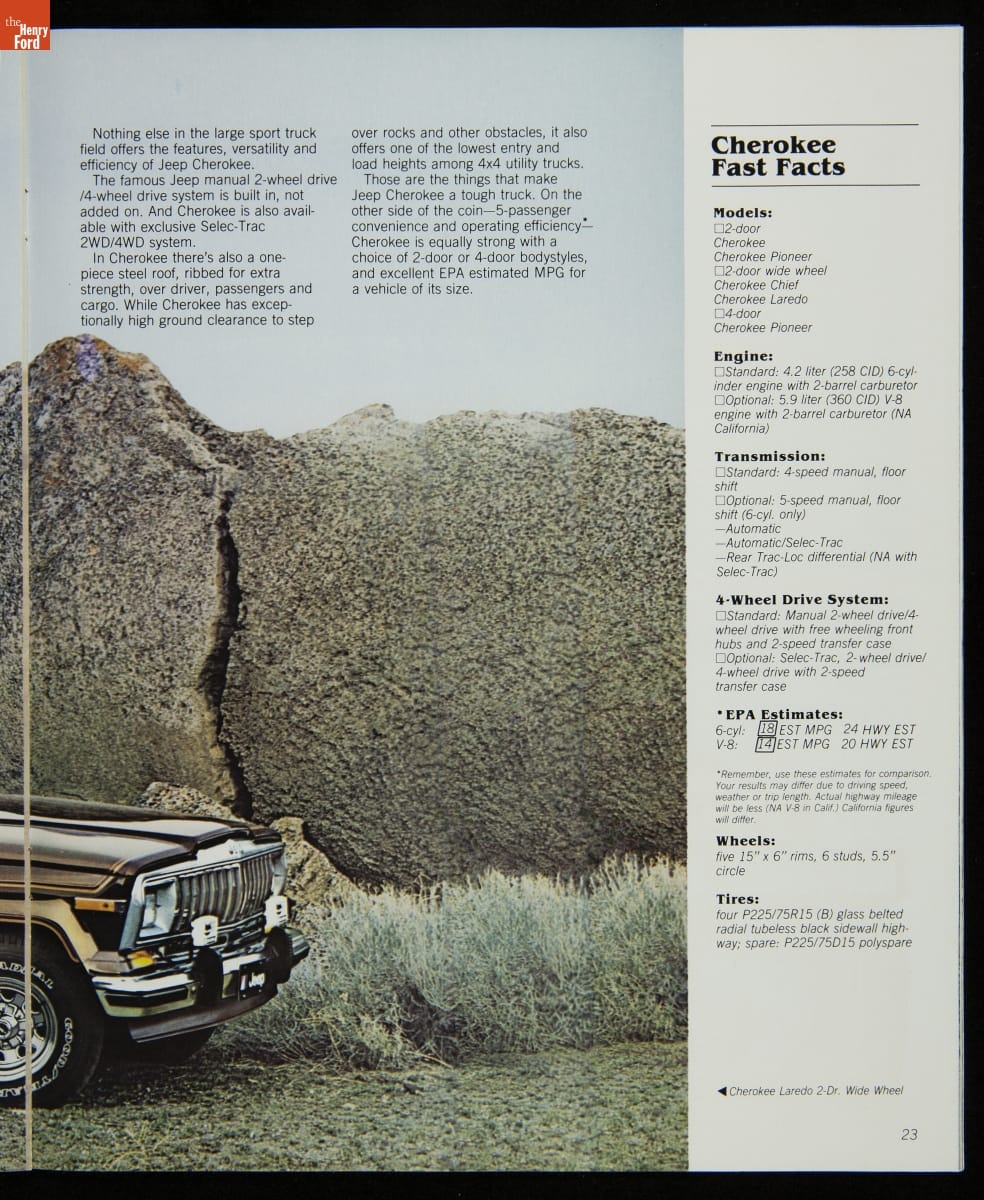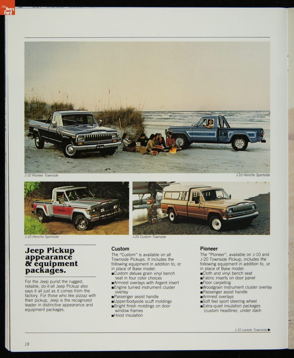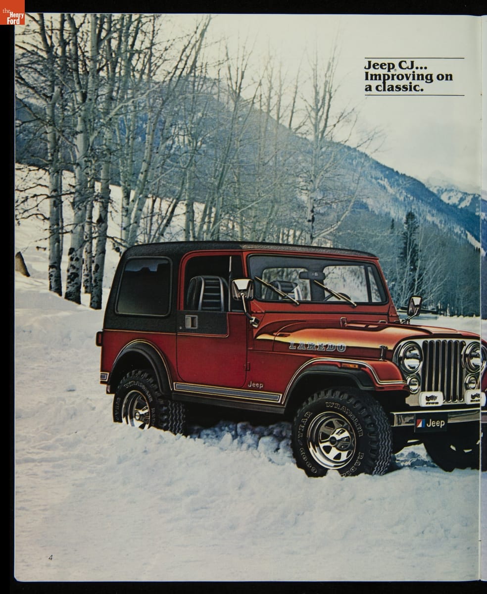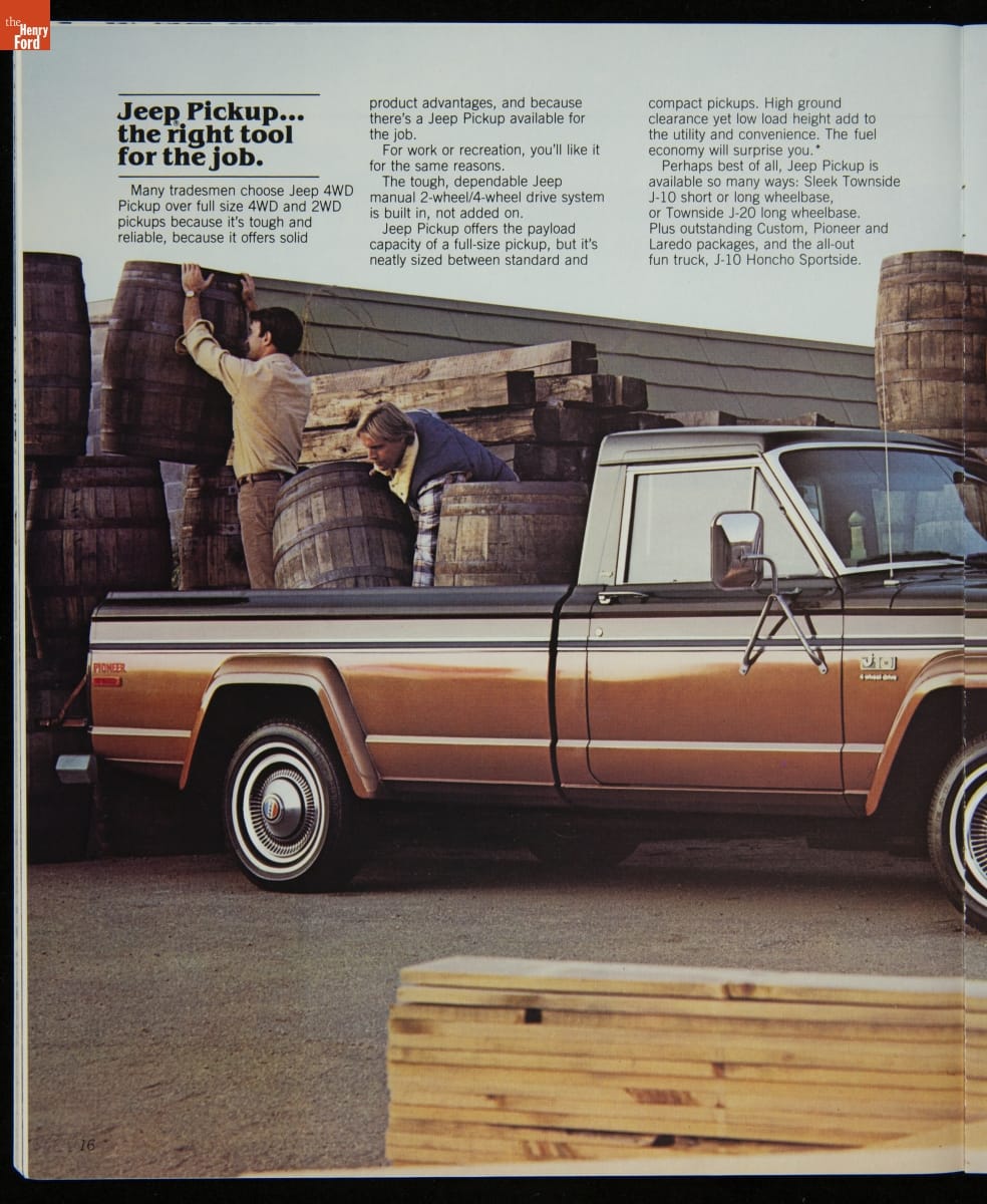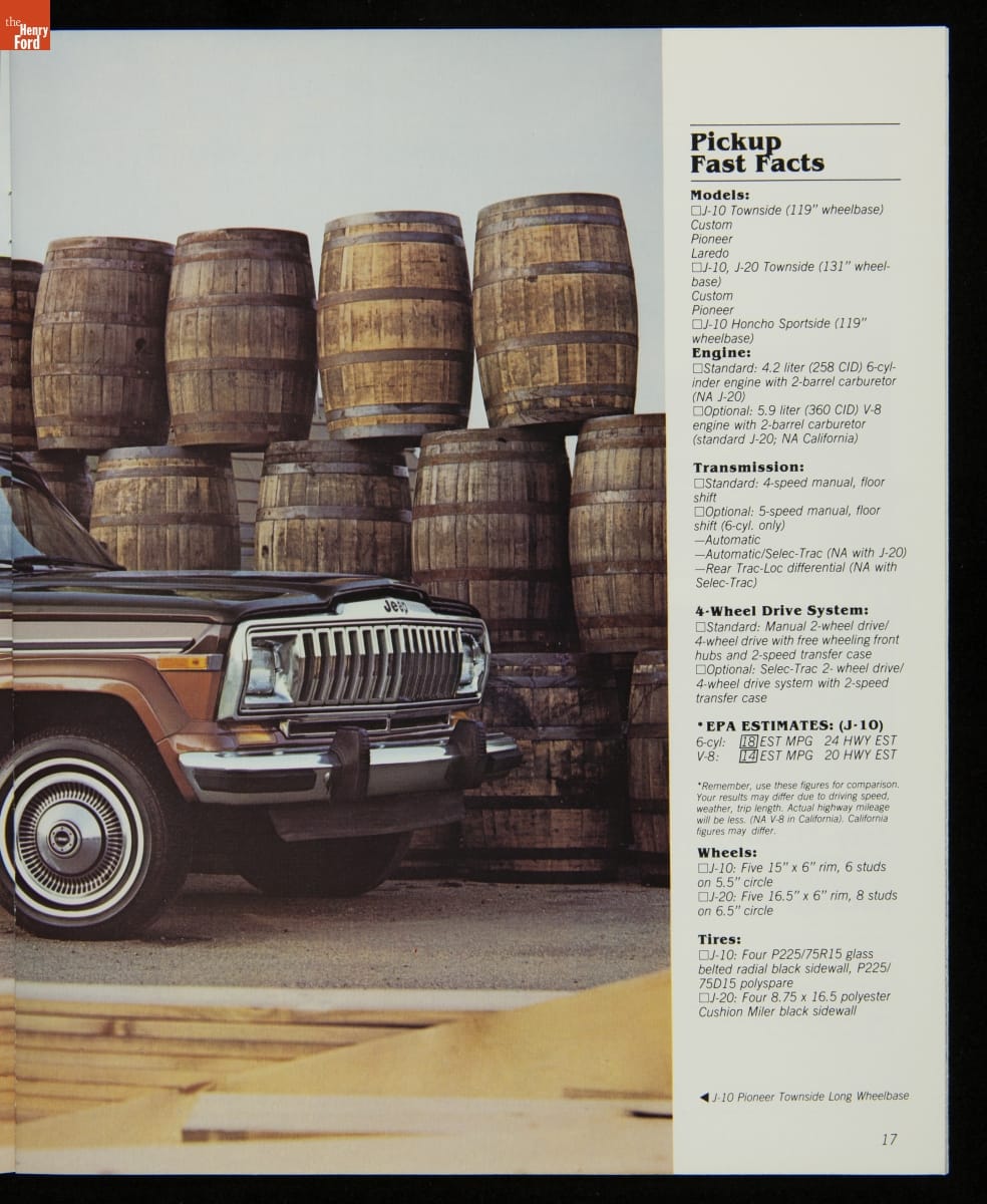 AMC's Jeep brand distinguished itself from the competition in this 1983 brochure. Jeep's pickups, wagons, and SUVs projected a rugged, off-road image. But by 1983, even the CJ-7 -- a direct descendant of the original military jeep -- was roomy and practical enough to serve as a family car. Jeep sold more than 113,000 vehicles worldwide in the 1983 calendar year.