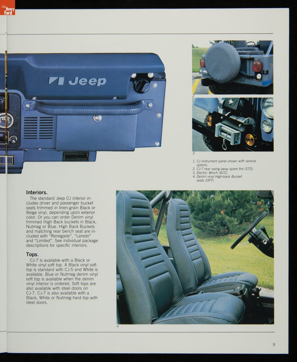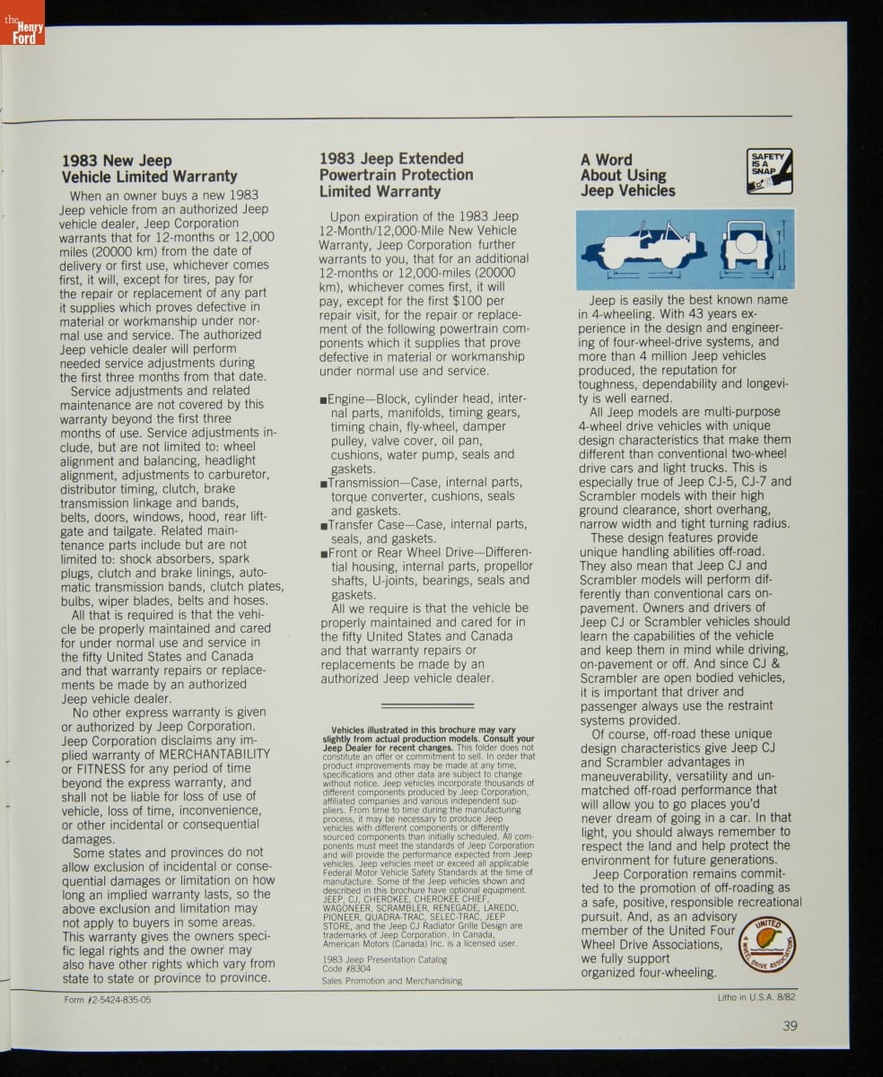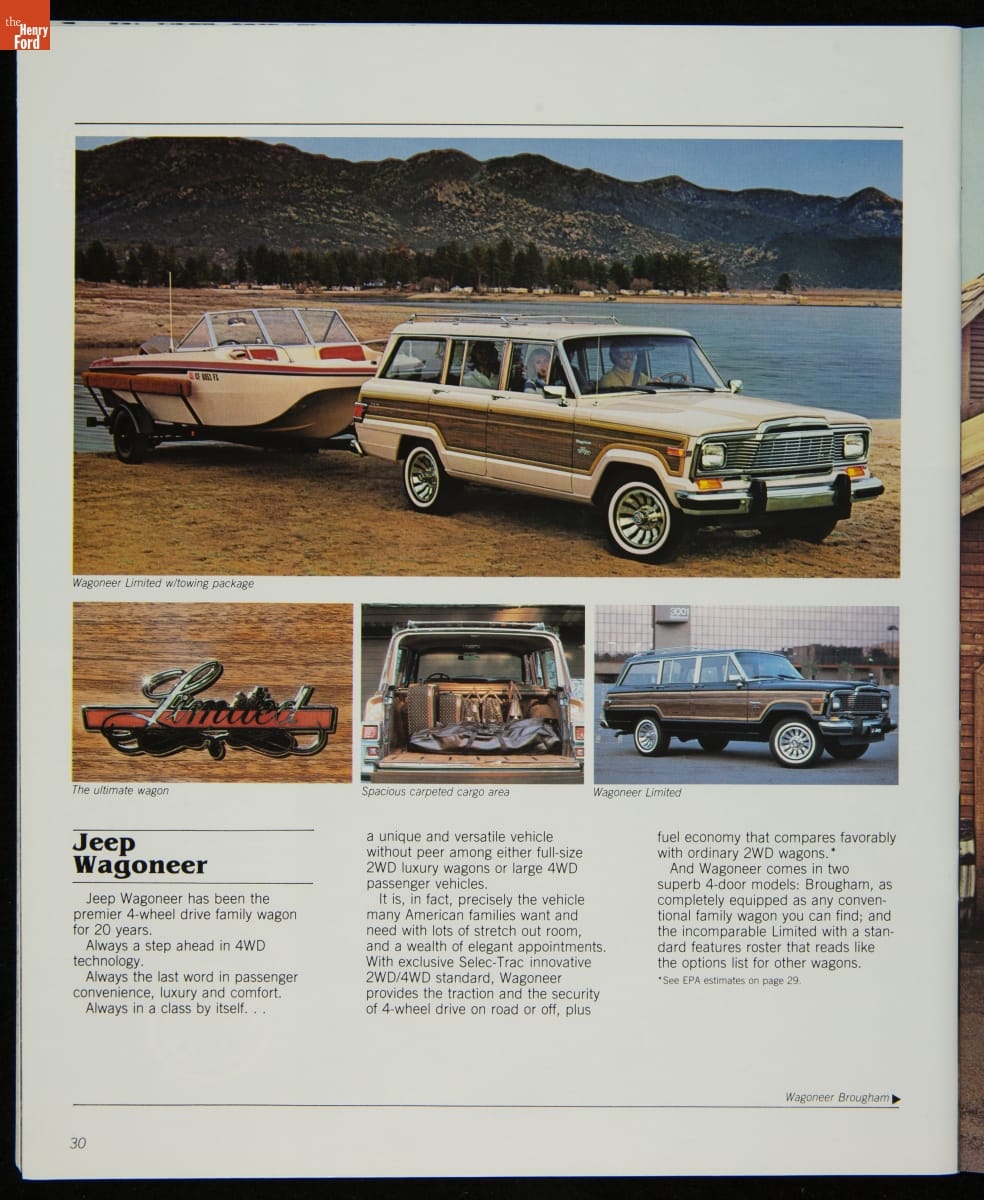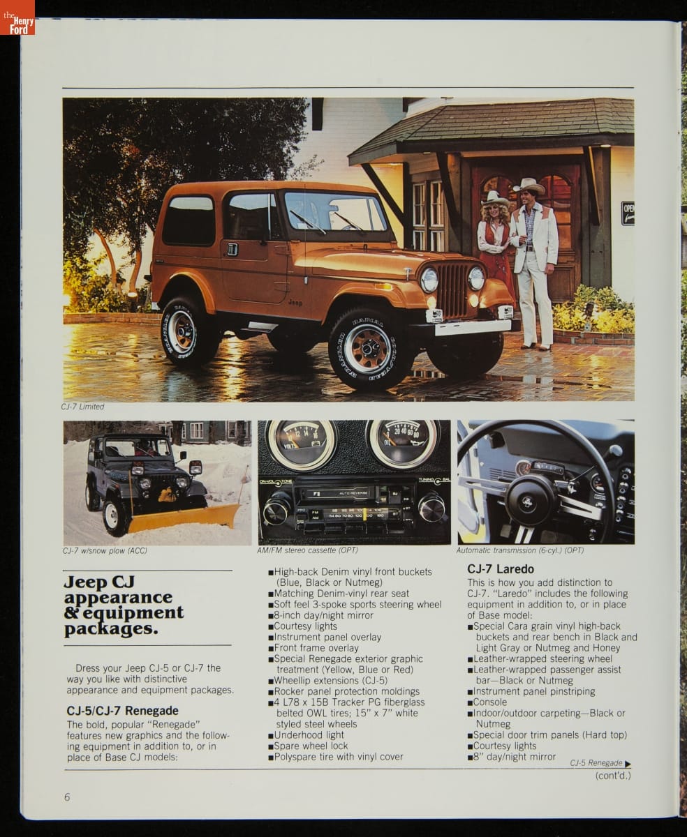 AMC's Jeep brand distinguished itself from the competition in this 1983 brochure. Jeep's pickups, wagons, and SUVs projected a rugged, off-road image. But by 1983, even the CJ-7 -- a direct descendant of the original military jeep -- was roomy and practical enough to serve as a family car. Jeep sold more than 113,000 vehicles worldwide in the 1983 calendar year.