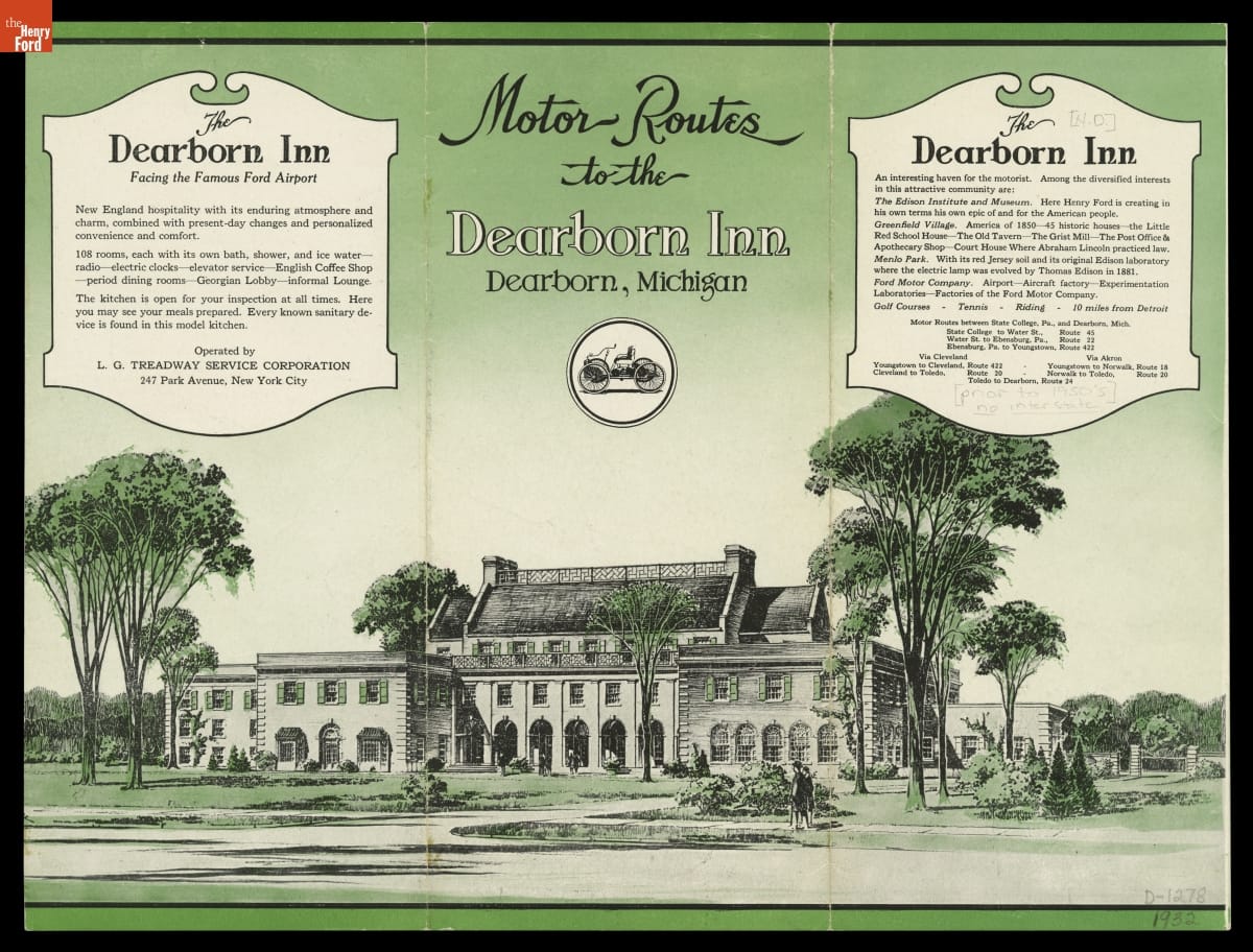 Henry and Edsel Ford contracted with L. G. Treadway Service Company of New York City to operate the Dearborn Inn in 1931, soon after it opened. The newly constructed first-class hotel differed from Treadway's other historic properties, but its corporate identity of recreating interiors reminiscent of a New England inn fit the Fords' idea. Treadway managed the Dearborn Inn until 1939.