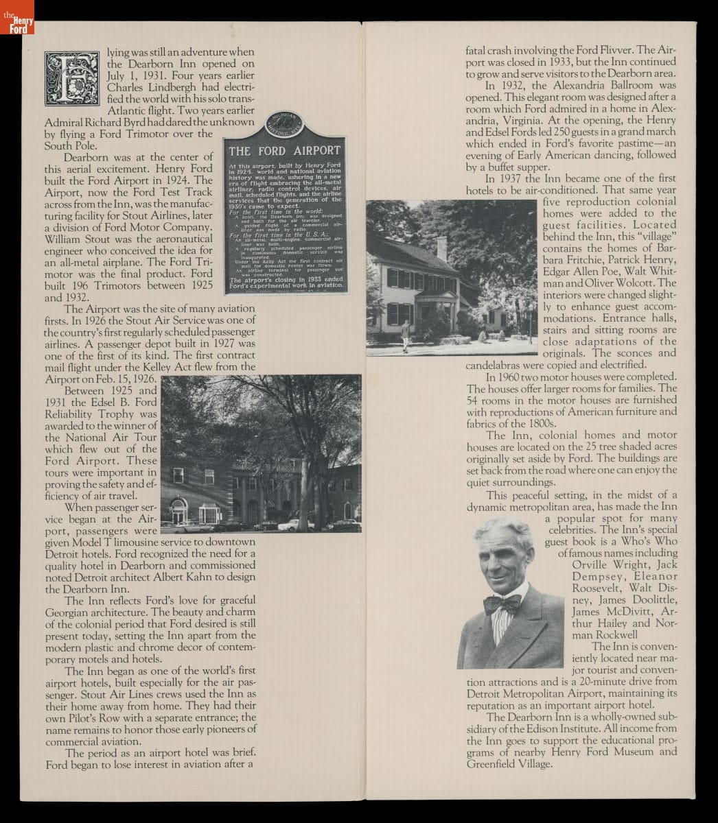 Edsel and Henry Ford conceived the Dearborn Inn as a business opportunity when it opened in 1931. Initially, the inn hosted pilots and travelers transiting through the nearby Ford Airport, but after the airport closed, it served visitors to Dearborn and Ford Motor Company. From the 1950s into the late 1980s, the inn was managed by the Edison Institute.