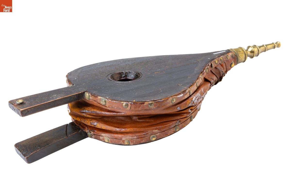 Have you ever fanned a fire? Historically, people used bellows to create updrafts of air to help ignite or sustain a fire in a hearth or stove. Moving the handled wood panels back and forth captured air in a leather chamber and expelled it out a metal nozzle. Some bellows were simple and undecorated; others were elaborately painted or carved; all were utilitarian.