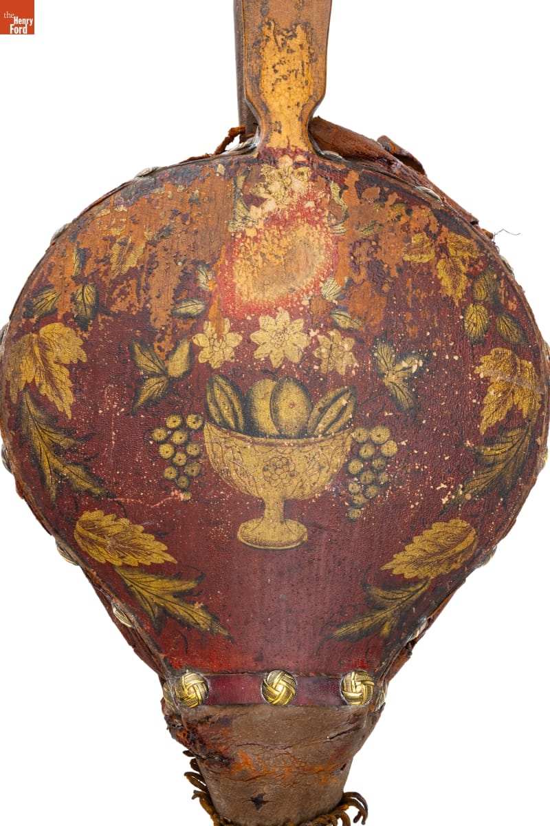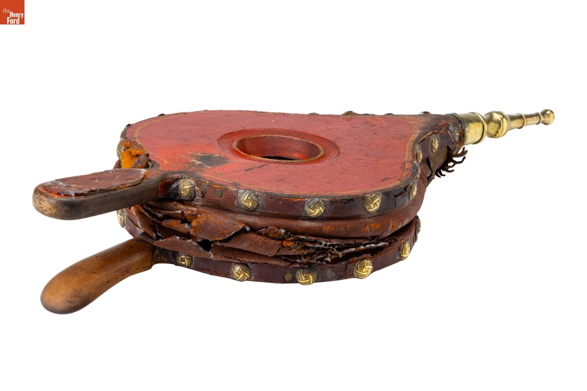 Have you ever fanned a fire? Historically, people used bellows to create updrafts of air to help ignite or sustain a fire in a hearth or stove. Moving the handled wood panels back and forth captured air in a leather chamber and expelled it out a metal nozzle. Some bellows were simple and undecorated; others were elaborately painted or carved; all were utilitarian.