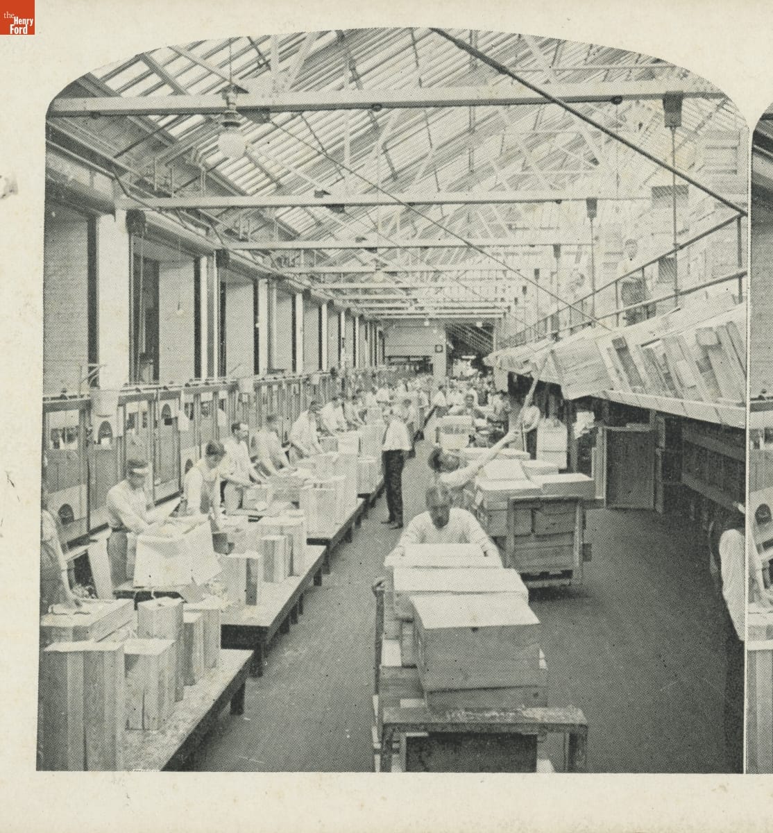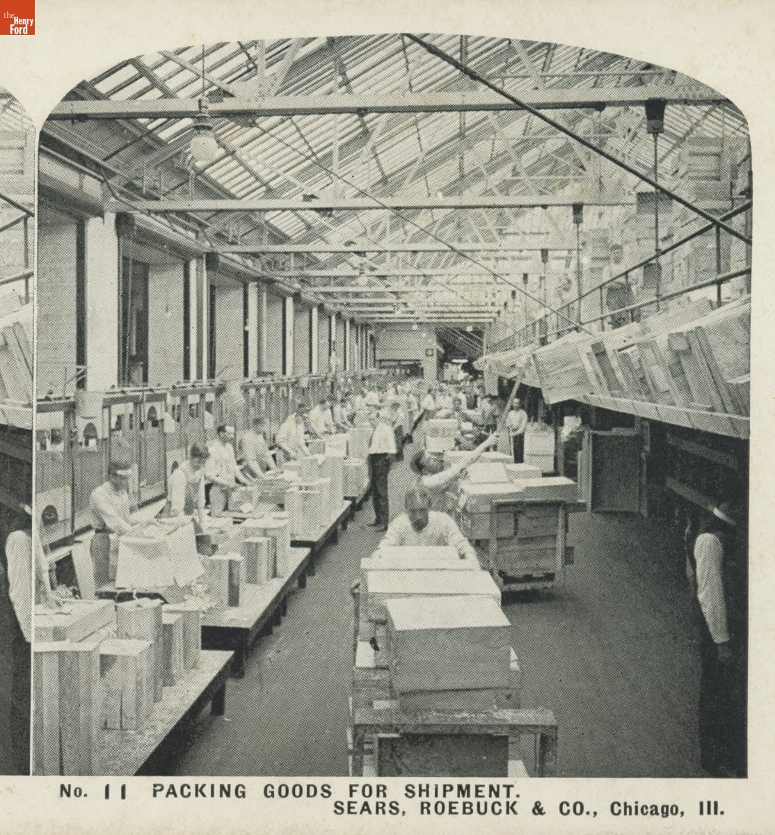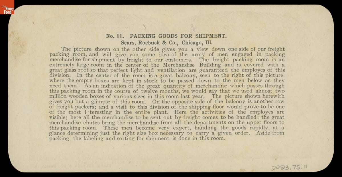 Mail-order firm Sears, Roebuck, & Co. had become one of America's largest corporations by the early 1900s. Sears was particularly popular among rural Americans, as it offered better options, lower costs, and more efficient delivery methods than traditional general stores. This stereograph, one of a set of 50 sold through the Sears catalog beginning in 1908, offered a behind-the-scenes look at the company's operation.