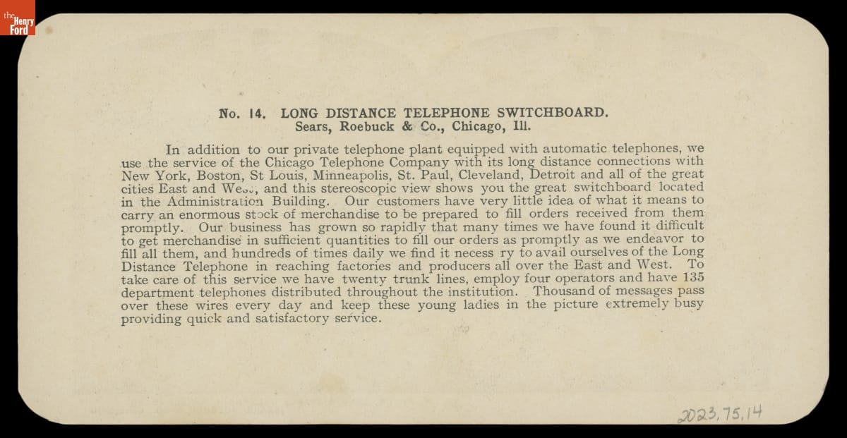 Mail-order firm Sears, Roebuck, & Co. had become one of America's largest corporations by the early 1900s. Sears was particularly popular among rural Americans, as it offered better options, lower costs, and more efficient delivery methods than traditional general stores. This stereograph, one of a set of 50 sold through the Sears catalog beginning in 1908, offered a behind-the-scenes look at the company's operation.