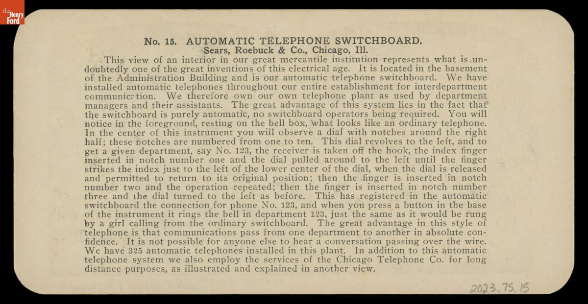 "Automatic Telephone Switchboard. Sears, Roebuck & Co., Chicago, Ill.," 1906-1908