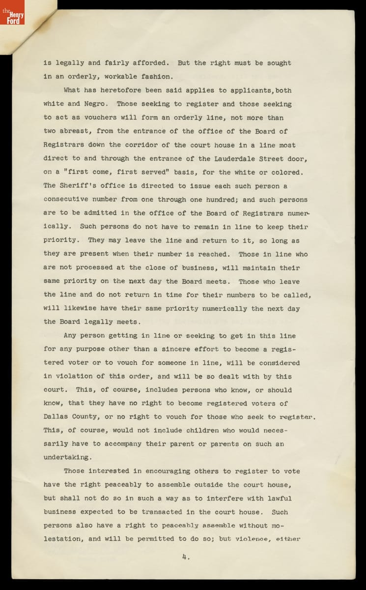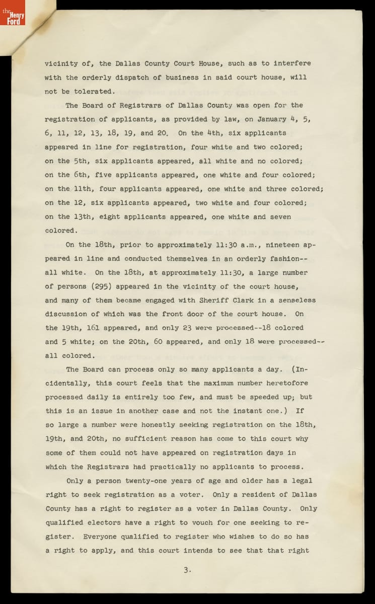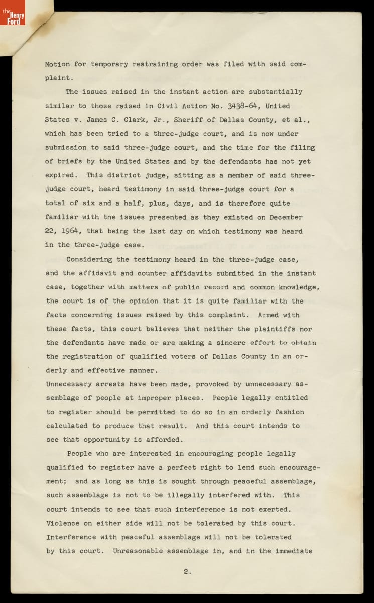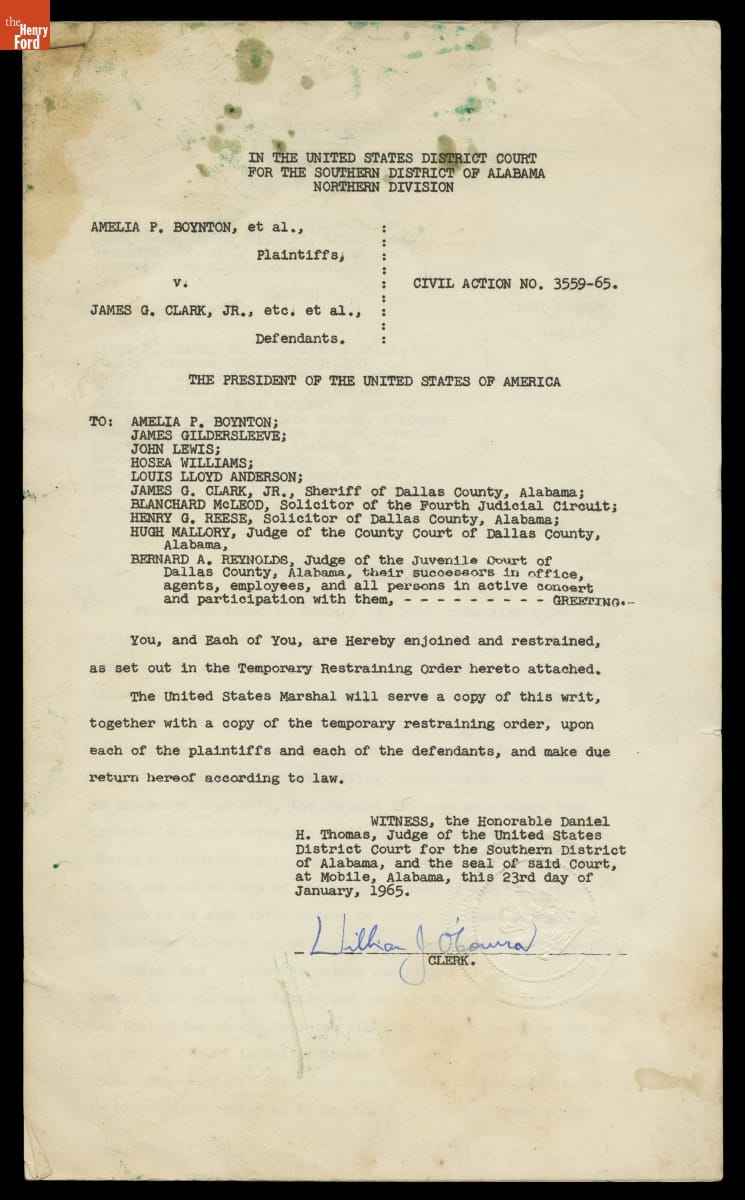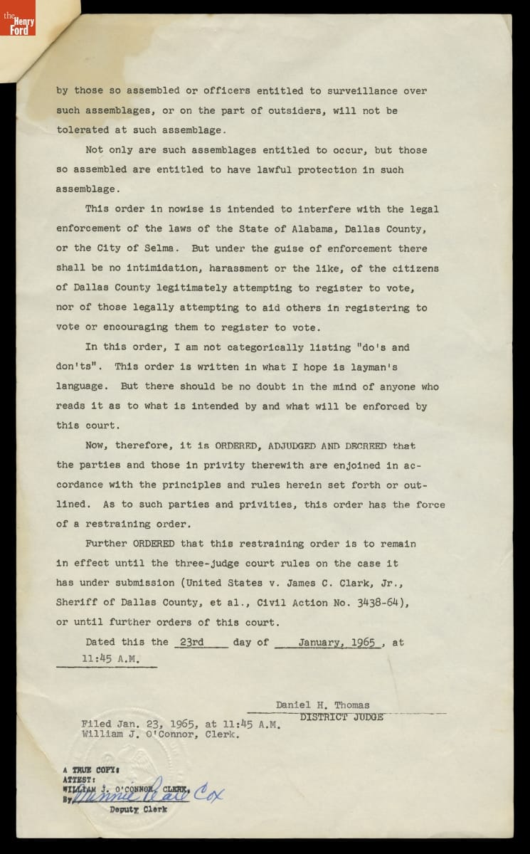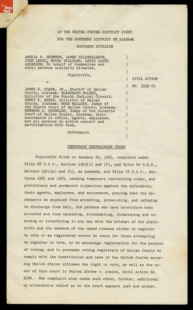 Temporary Restraining Order to Stop Interference with Voter Registration in Selma, Alabama, Filed January 1965