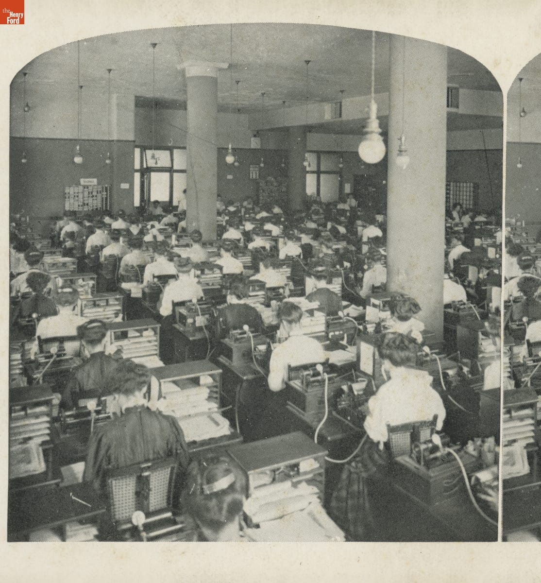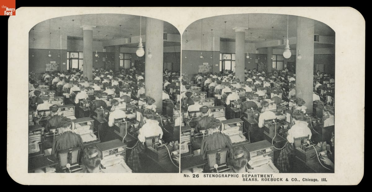 Mail-order firm Sears, Roebuck, & Co. had become one of America's largest corporations by the early 1900s. Sears was particularly popular among rural Americans, as it offered better options, lower costs, and more efficient delivery methods than traditional general stores. This stereograph, one of a set of 50 sold through the Sears catalog beginning in 1908, offered a behind-the-scenes look at the company's operation.