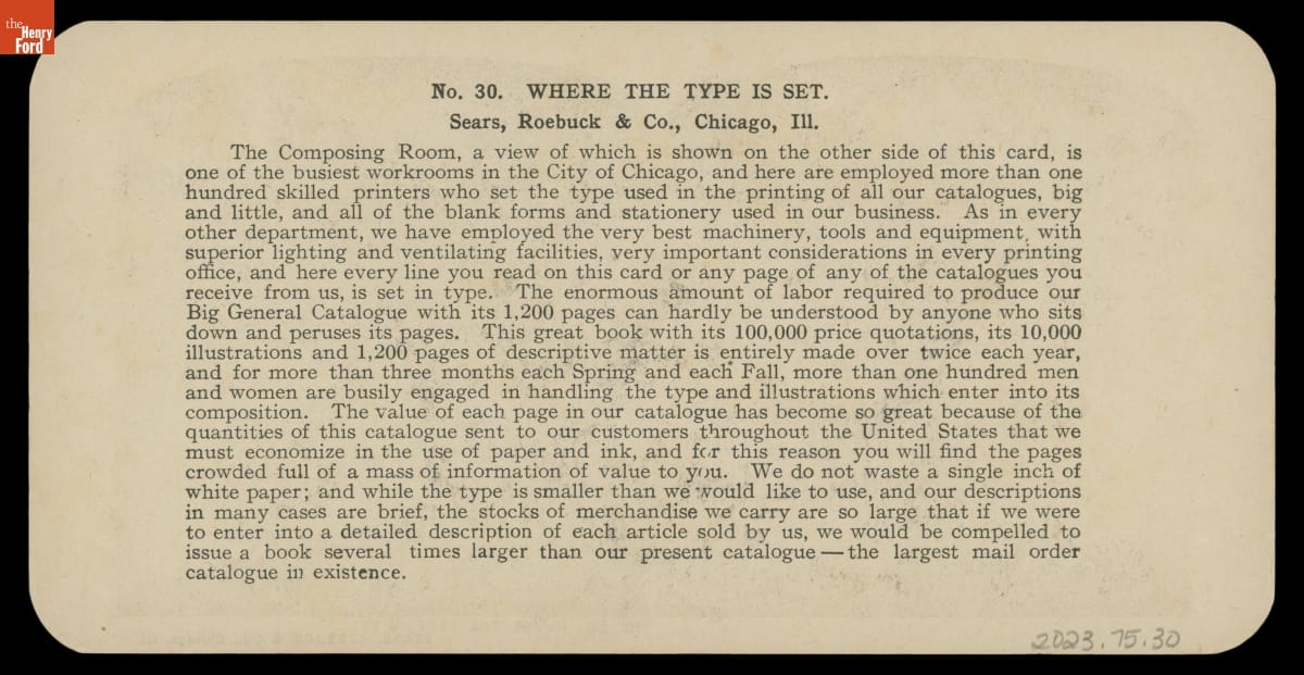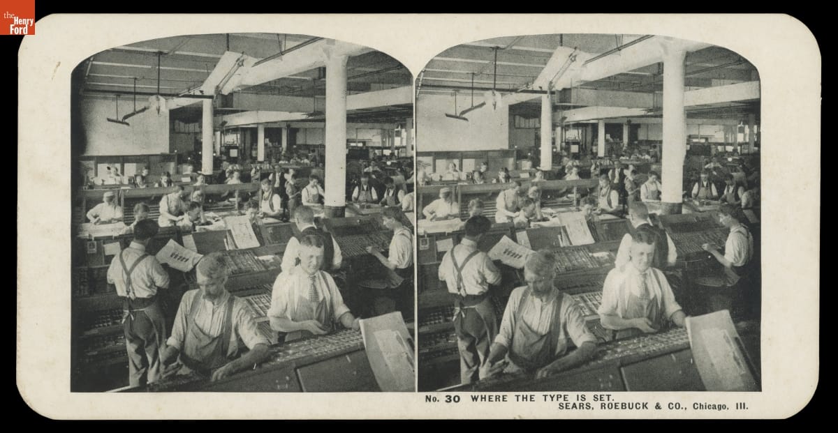 Mail-order firm Sears, Roebuck, & Co. had become one of America's largest corporations by the early 1900s. Sears was particularly popular among rural Americans, as it offered better options, lower costs, and more efficient delivery methods than traditional general stores. This stereograph, one of a set of 50 sold through the Sears catalog beginning in 1908, offered a behind-the-scenes look at the company's operation.