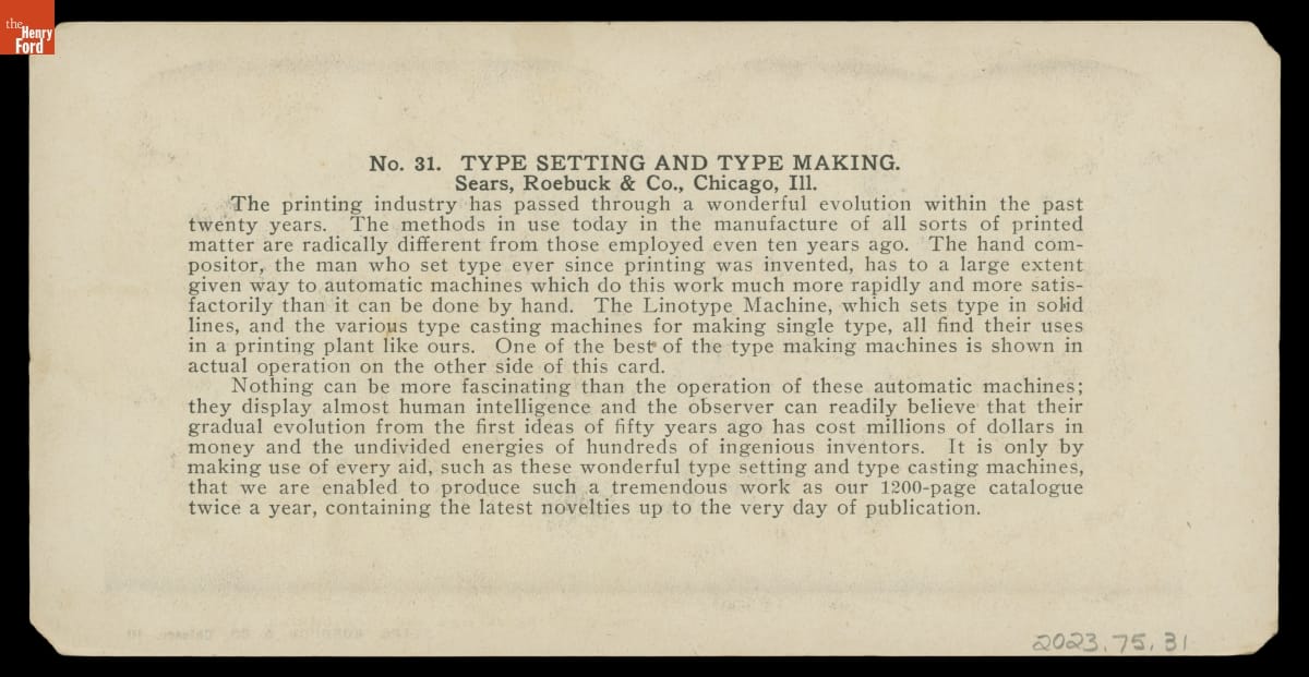 "Type Setting and Type Making. Sears, Roebuck & Co., Chicago, Ill.," 1906-1908