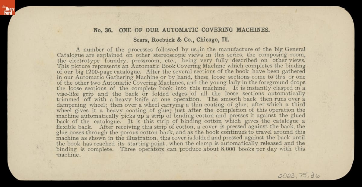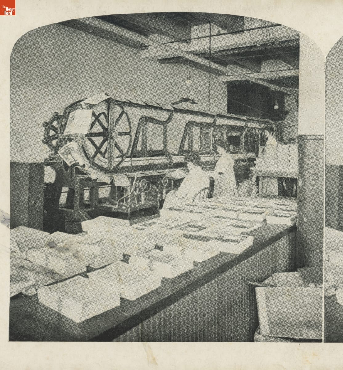 Mail-order firm Sears, Roebuck, & Co. had become one of America's largest corporations by the early 1900s. Sears was particularly popular among rural Americans, as it offered better options, lower costs, and more efficient delivery methods than traditional general stores. This stereograph, one of a set of 50 sold through the Sears catalog beginning in 1908, offered a behind-the-scenes look at the company's operation.