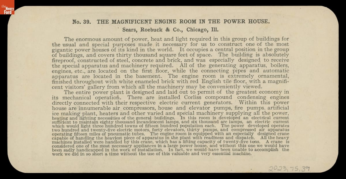 "The Magnificent Engine Room in the Power House. Sears, Roebuck & Co., Chicago, Ill.," 1906-1908