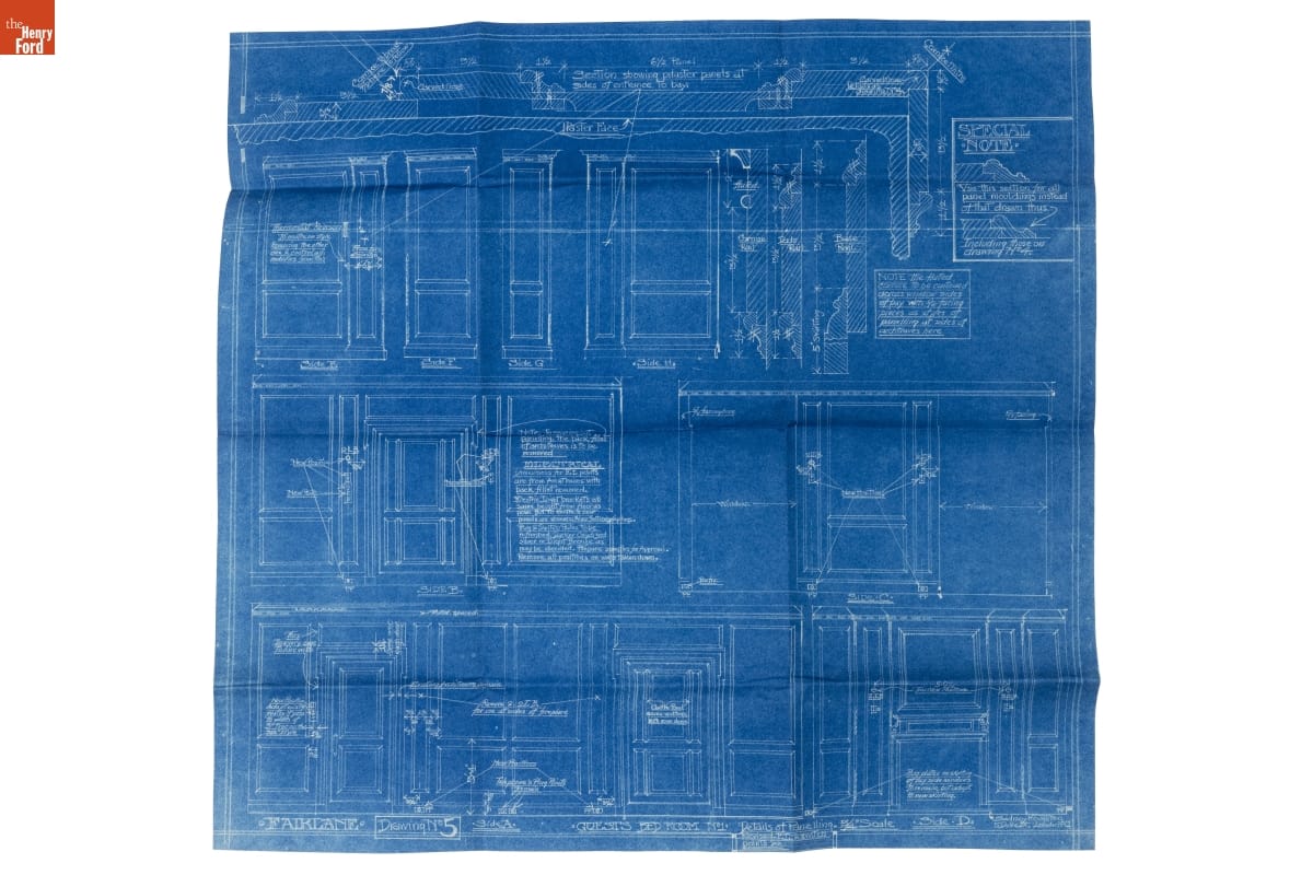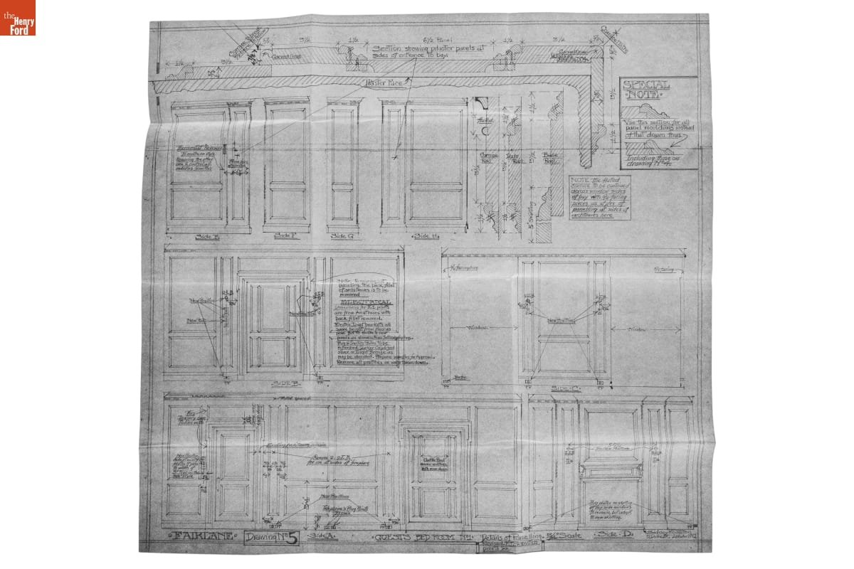 Sidney Houghton, a London-based interior designer, met Henry Ford during World War I. Houghton worked on Ford's "Eagle Boats," supplied to the U.S. and British Navies. Following the War, Henry and Clara Ford commissioned Houghton to create a variety of interiors for their home and other projects. Houghton submitted this drawing detailing the interiors of Fair Lane, the Ford Estate in Dearborn, Michigan.