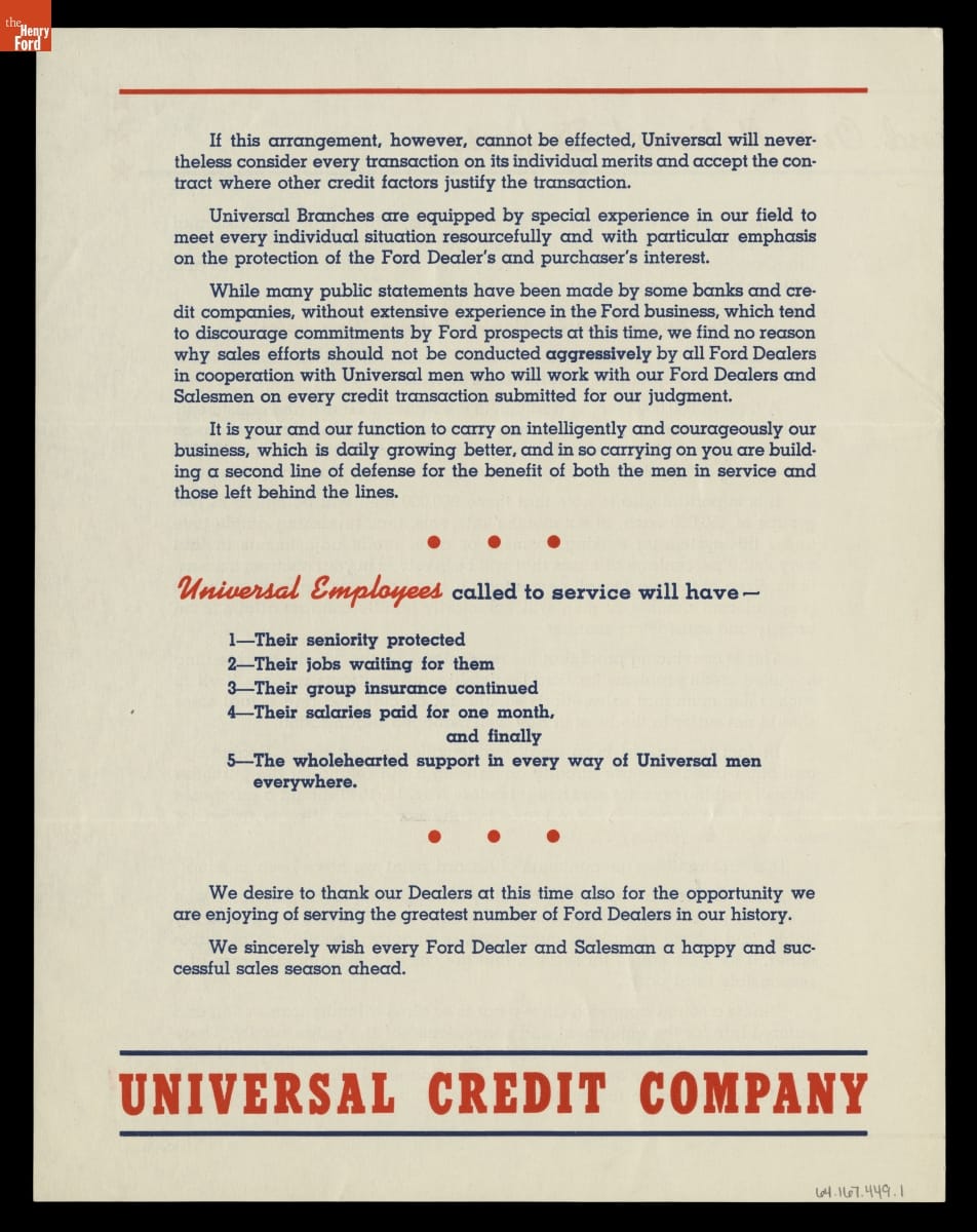 In 1928, Ford Motor Company established Universal Credit Company (UCC) to allow customers to finance their cars. UCC loaned money that buyers paid back over time, and it helped Ford and its dealers in an increasingly competitive marketplace. Ford sold the company five years later, but UCC remained a primary financer for buyers of Ford vehicles.