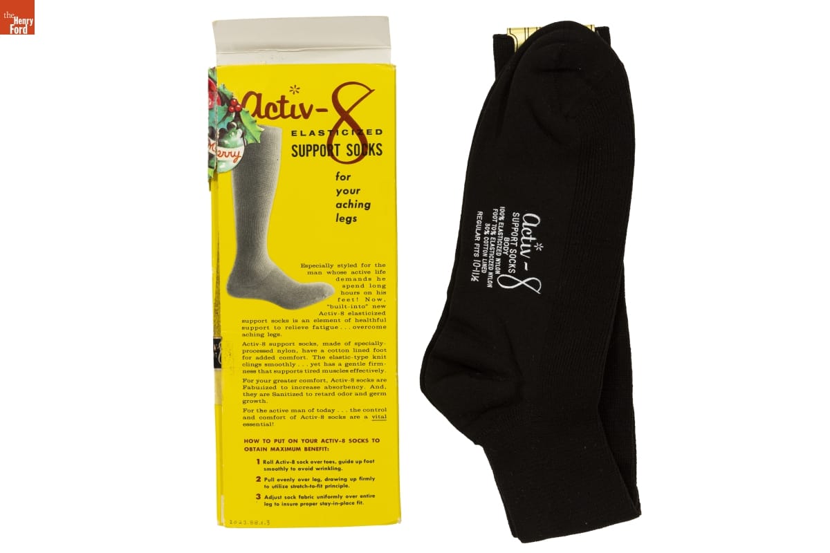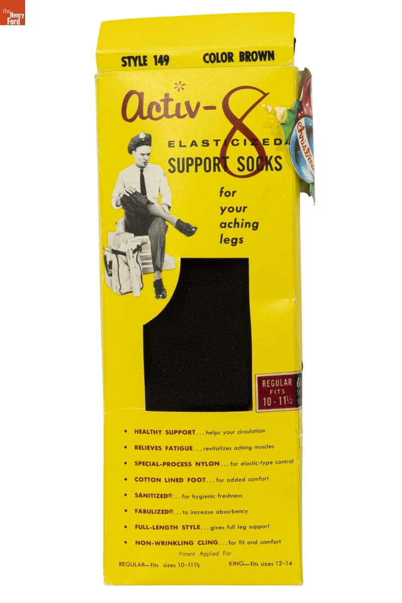 Activ-8 / ELASTICIZED / SUPPORT SOCKS / for / your / aching / legs / Especially styled for the / man whose active life / demands he / spend long / hours on his / feet! Now, / "built-into" new / Activ-8 [...] / HOW TO PUT ON YOUR ACTIV-8 SOCKS TO / OBTAIN MAXIMUM BENEFIT: / 1 Roll Activ-8 sock over toes, guide up foot / smoothly to avoid wrinkling. / 2 Pull evenly over leg, drawing up firmly / to utilize stretch-to-fit principle. / 3 Adjust sock fabric uniformly over entire / leg to insure proper stay-in-place fit.