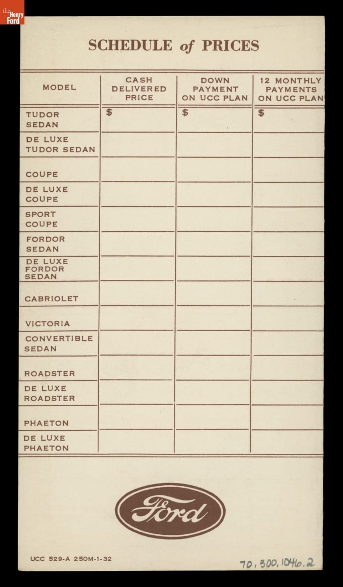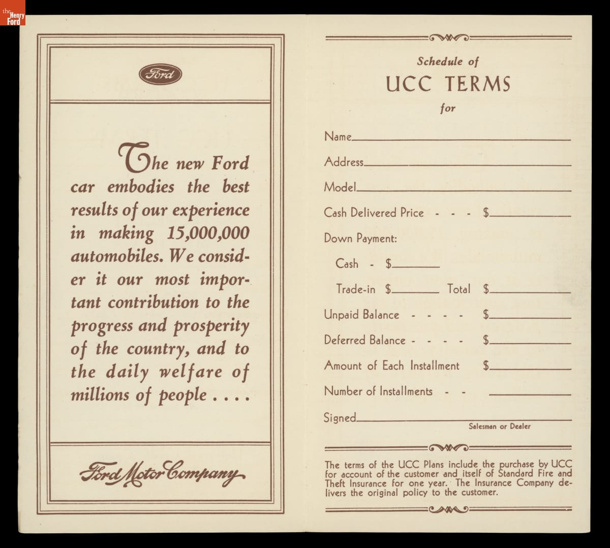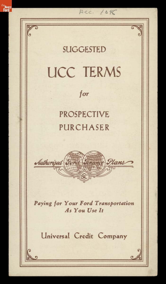 In 1928, Ford Motor Company established Universal Credit Company (UCC) to allow customers to finance their cars. UCC loaned money that buyers paid back over time, and it helped Ford and its dealers in an increasingly competitive marketplace. Ford sold the company five years later, but UCC remained a primary financer for buyers of Ford vehicles.