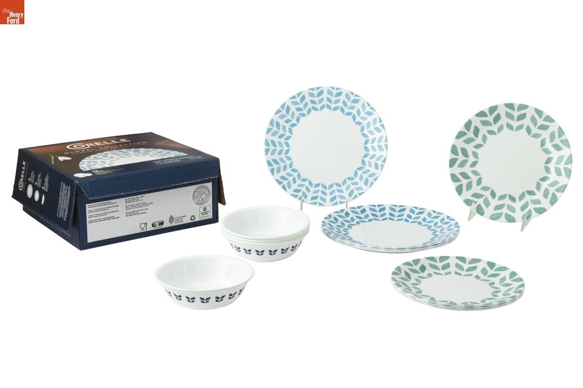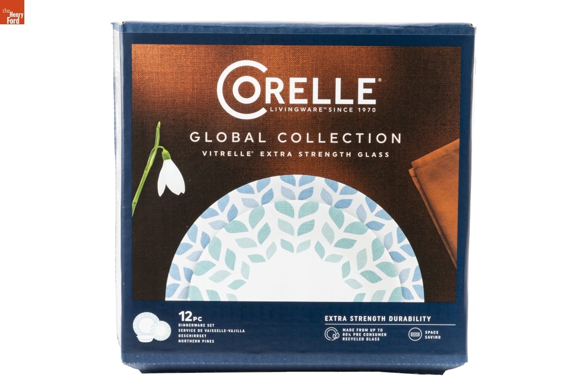 CORELLE(R) / LIVINGWARE[TM] SINCE 1970 / GLOBAL COLLECTION / VITRELLE(R) EXTRA STRENGTH GLASS / 12 PC / DINNERWARE SET / [...] / NORTHERN PINES / EXTRA STRENGTH DURABILITY / MADE FROM UP TO / 80% PRE CONSUMER / RECYCLED GLASS / SPACE / SAVING