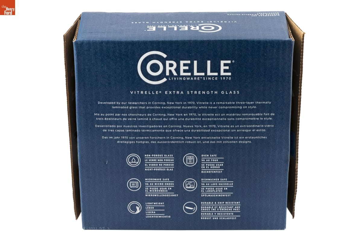 CORELLE(R) / LIVINGWARE[TM] SINCE 1970 / VITRELLE(R) EXTRA STRENGTH GLASS / Developed by our researchers in Corning, New York in 1970, Vitrelle is a remarkable three-layer thermally / laminated glass that provides exceptional durability while never compromising on style. / [...]
