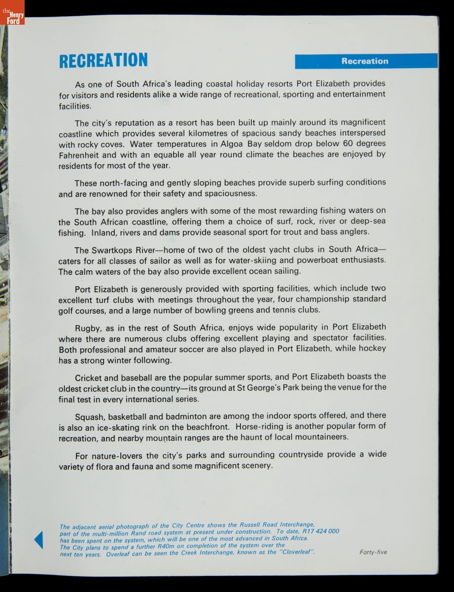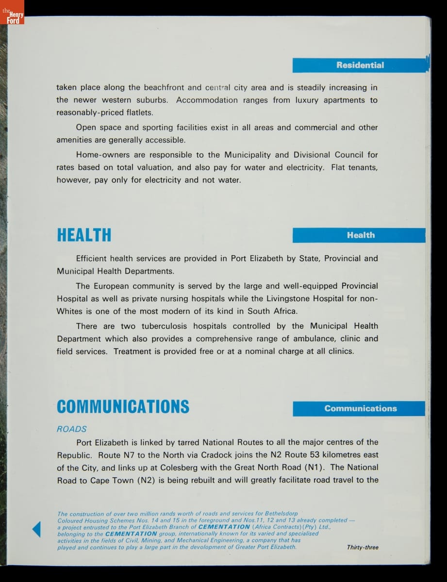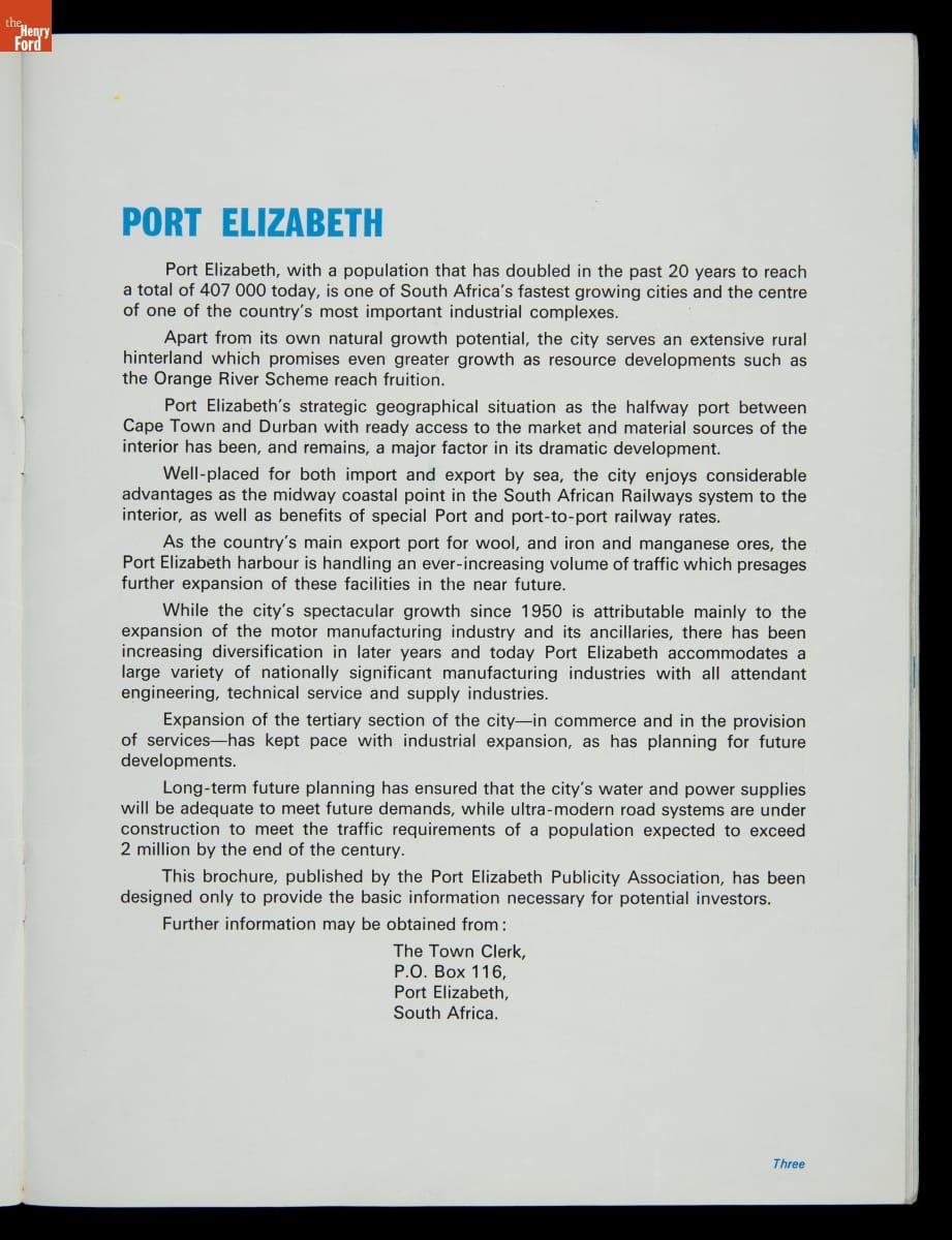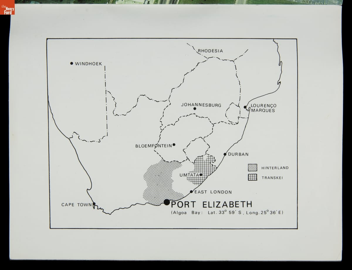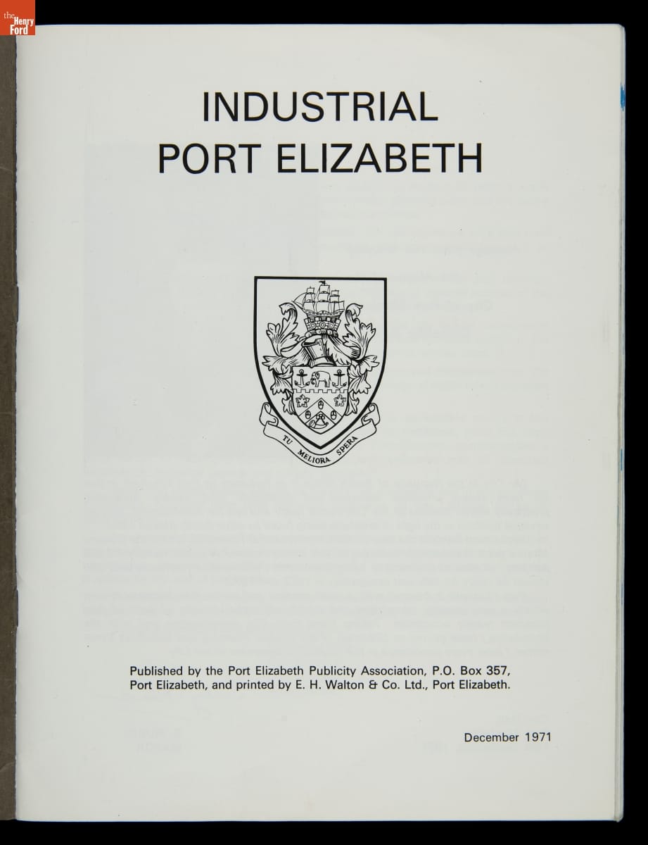 The Port Elizabeth Publicity Association created this brochure to promote the benefits of the South African city. Sections touted the advantages of the region's infrastructure, climate, location, and commercial and industrial possibilities for potential investors. However, the publication's glowing descriptions glossed over apartheid -- the system of harsh racial segregation imposed by the minority white South African government.