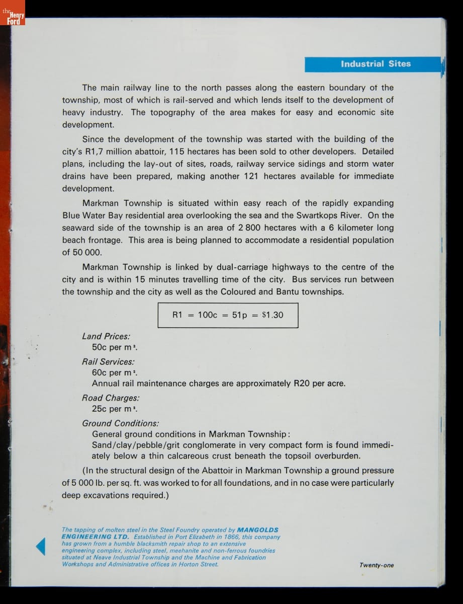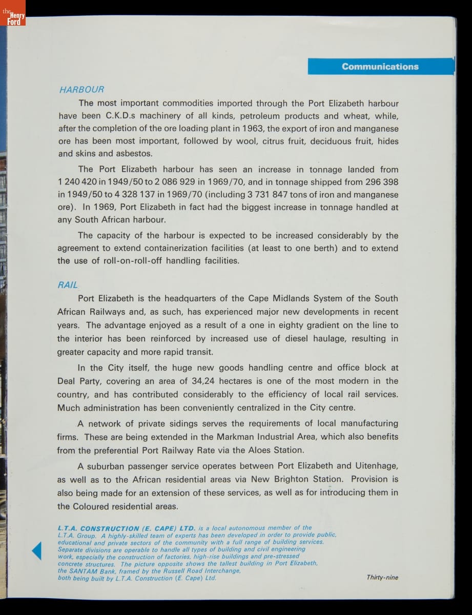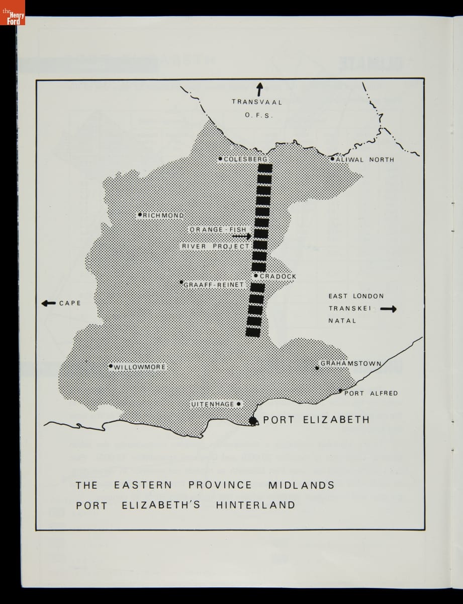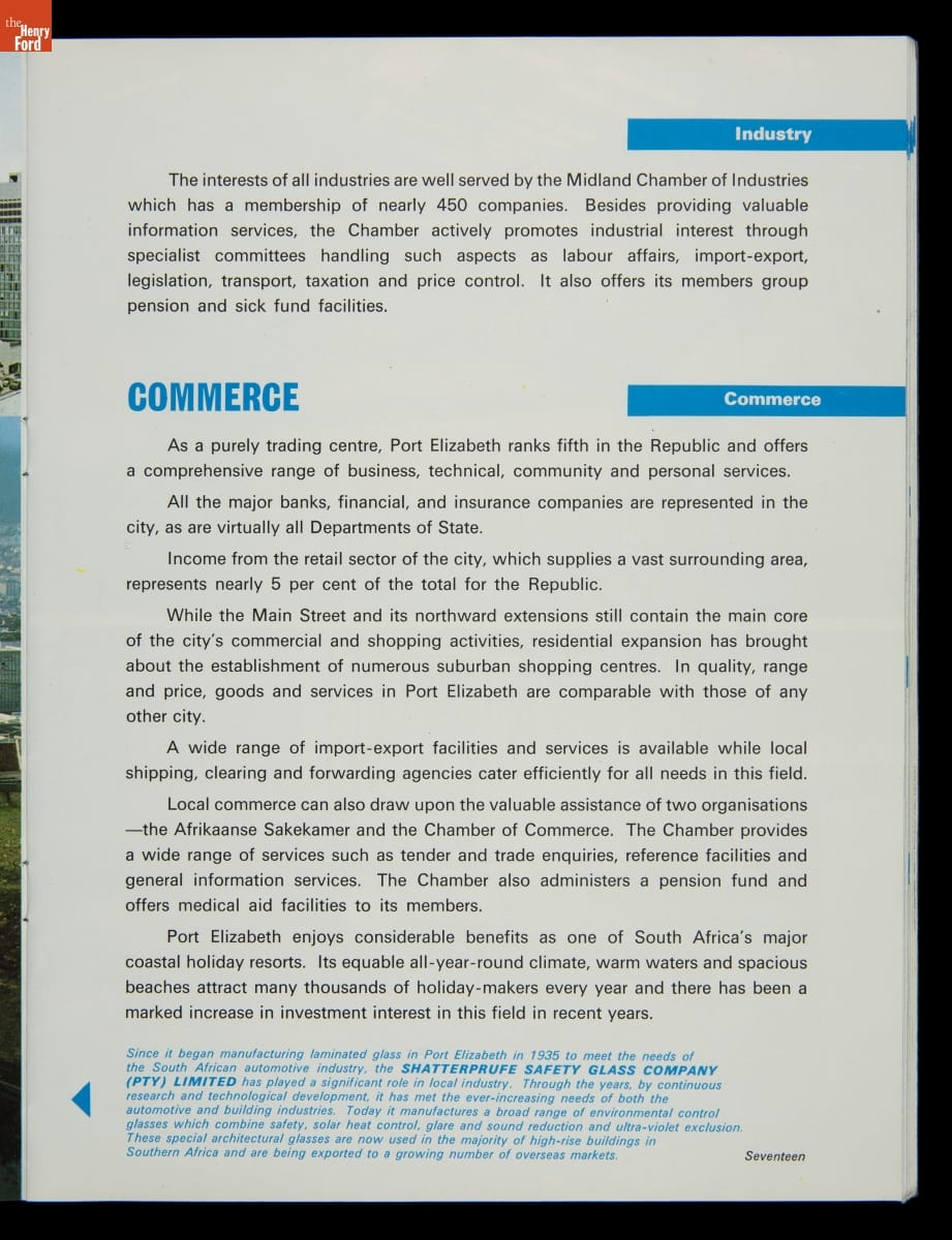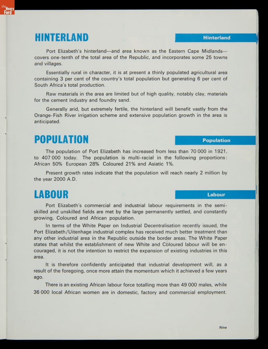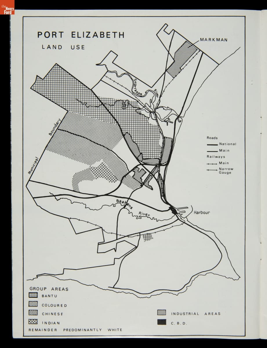 The Port Elizabeth Publicity Association created this brochure to promote the benefits of the South African city. Sections touted the advantages of the region's infrastructure, climate, location, and commercial and industrial possibilities for potential investors. However, the publication's glowing descriptions glossed over apartheid -- the system of harsh racial segregation imposed by the minority white South African government.