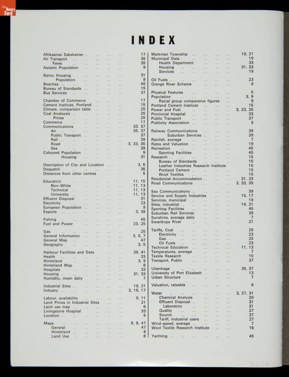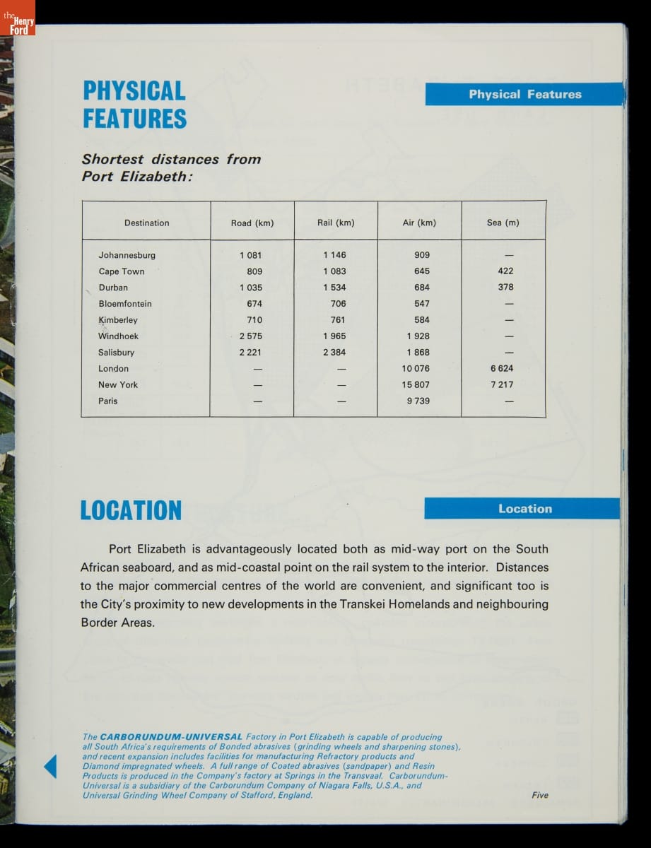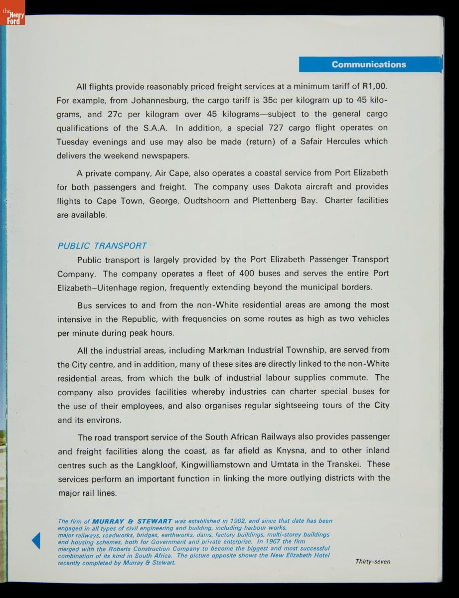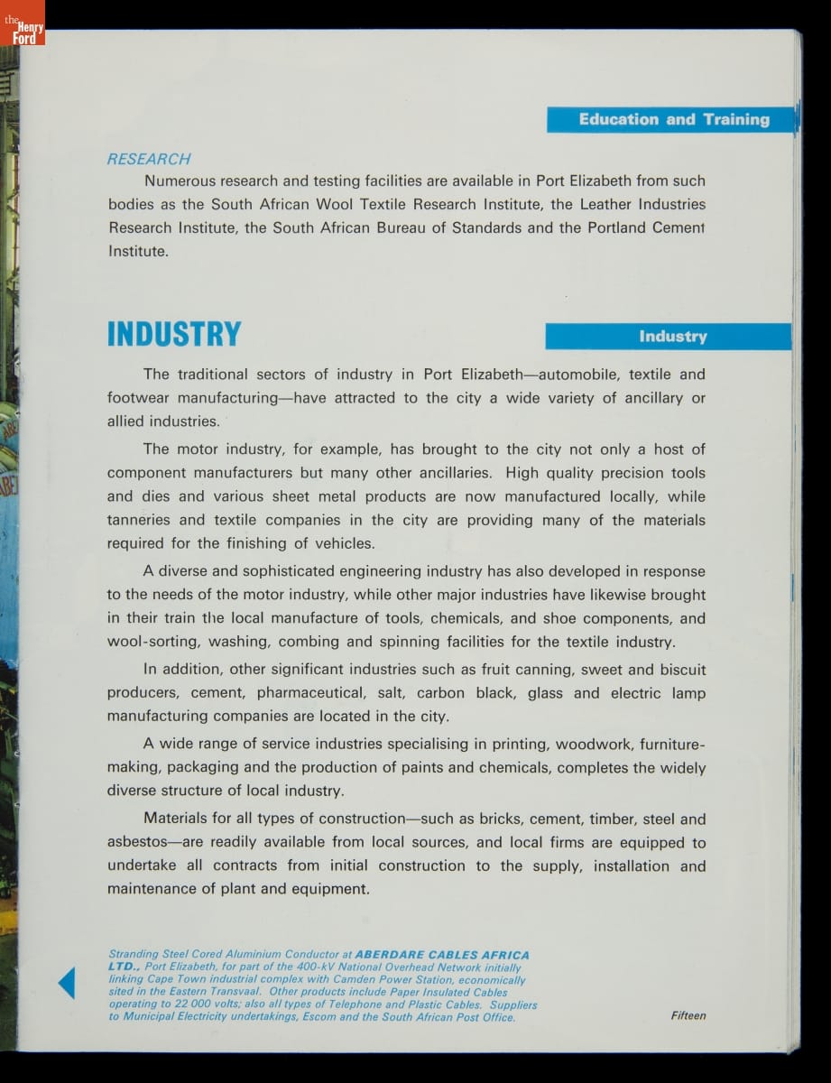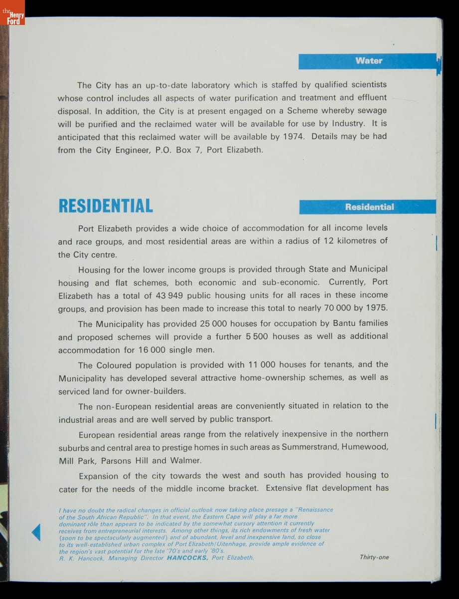 The Port Elizabeth Publicity Association created this brochure to promote the benefits of the South African city. Sections touted the advantages of the region's infrastructure, climate, location, and commercial and industrial possibilities for potential investors. However, the publication's glowing descriptions glossed over apartheid -- the system of harsh racial segregation imposed by the minority white South African government.