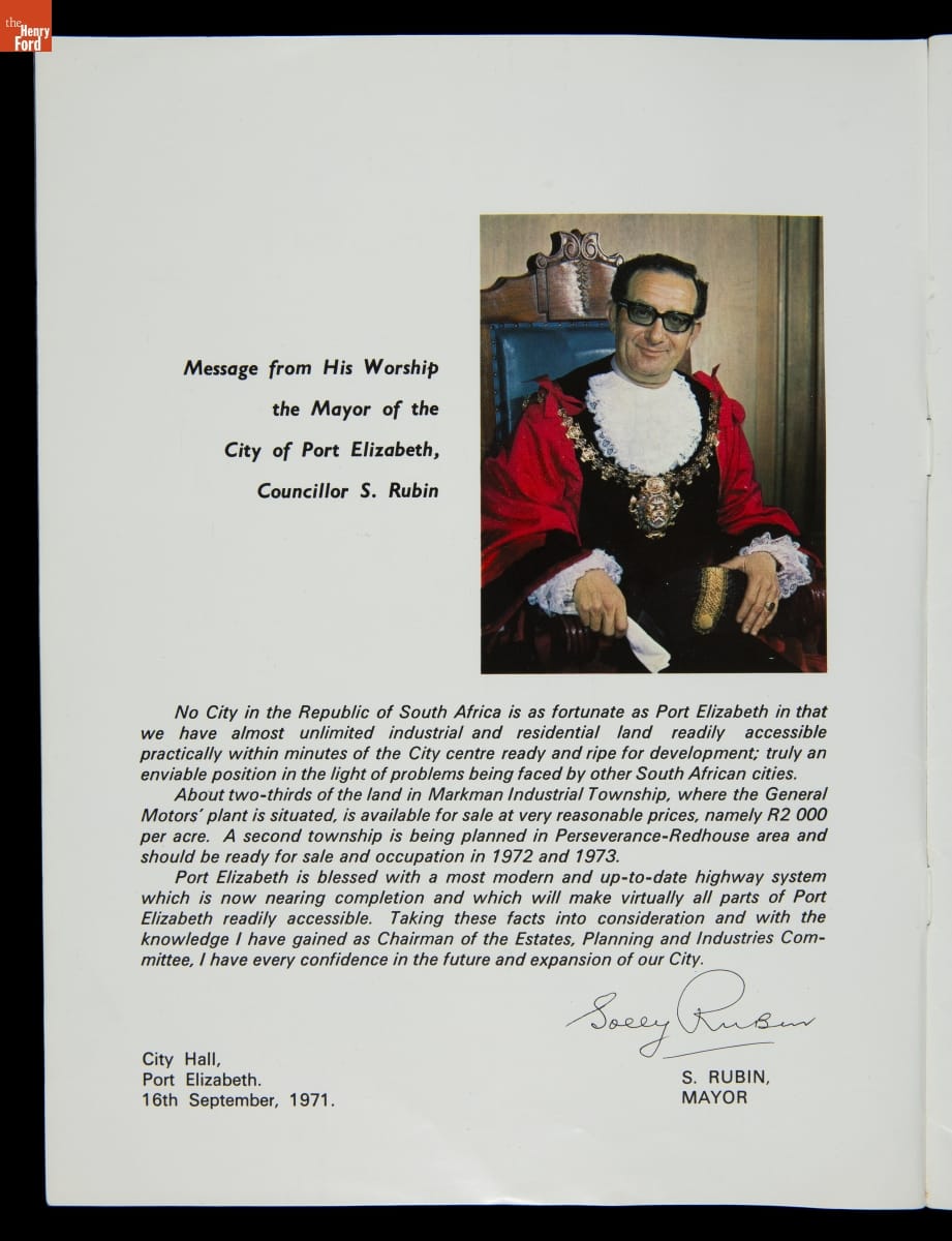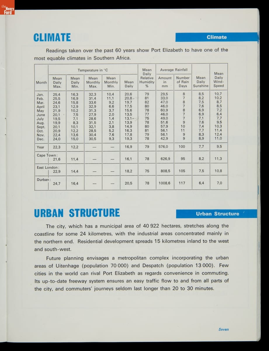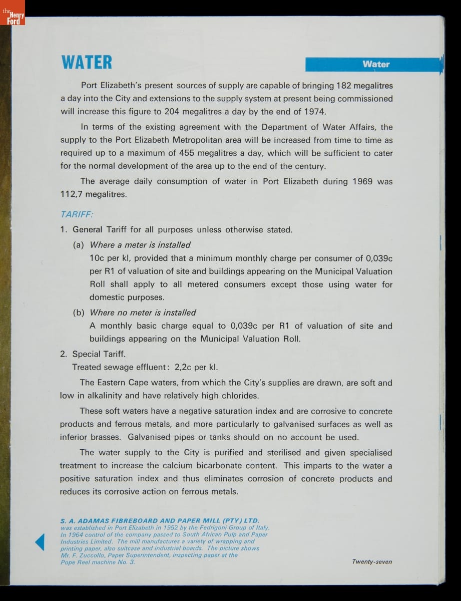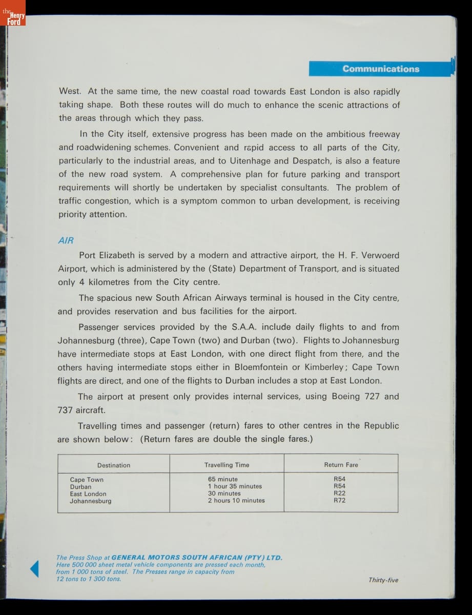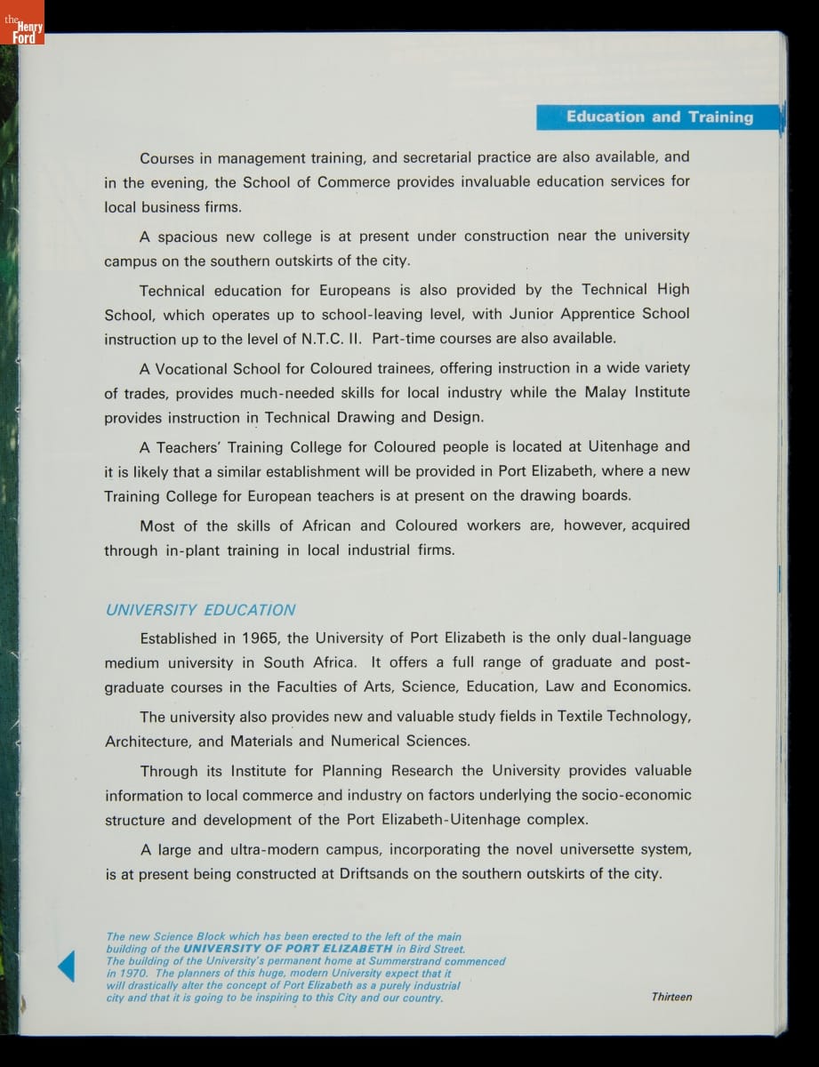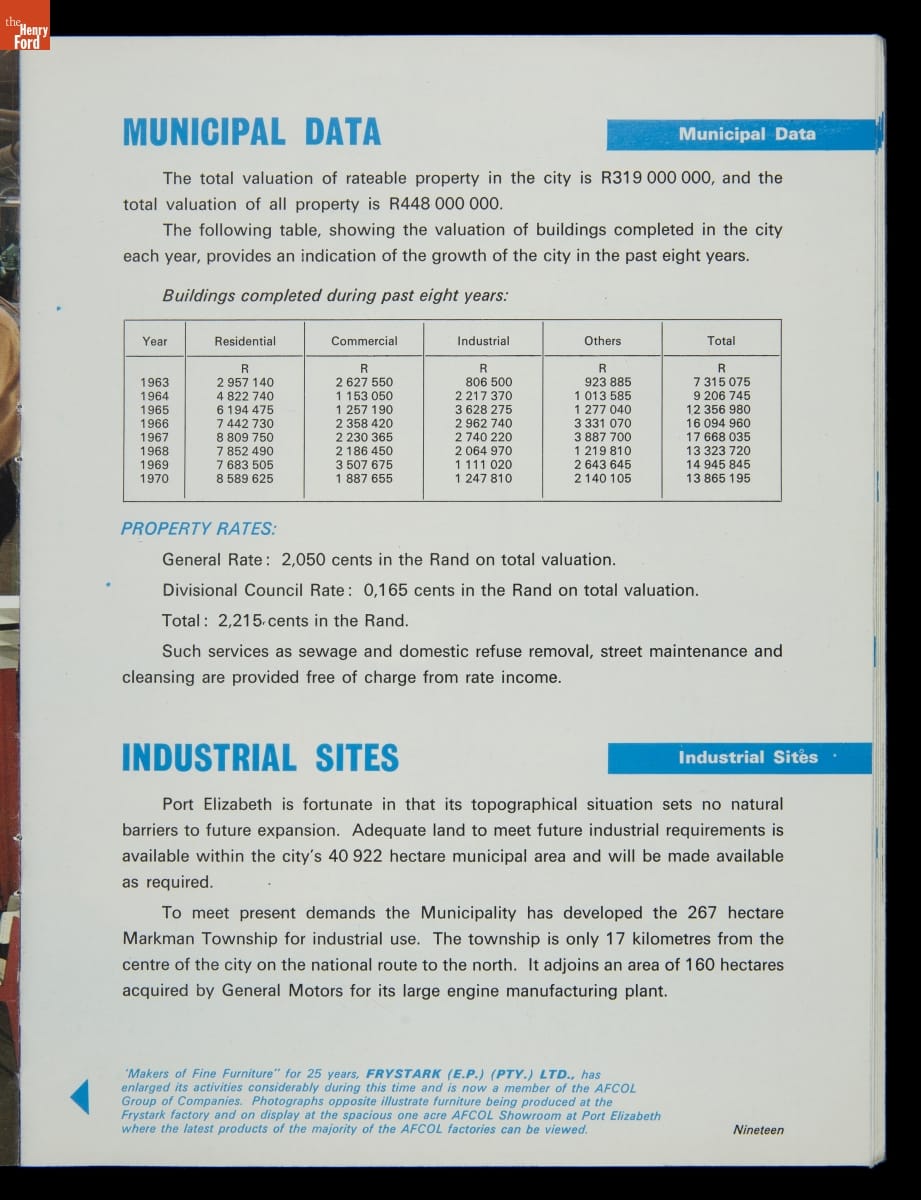 The Port Elizabeth Publicity Association created this brochure to promote the benefits of the South African city. Sections touted the advantages of the region's infrastructure, climate, location, and commercial and industrial possibilities for potential investors. However, the publication's glowing descriptions glossed over apartheid -- the system of harsh racial segregation imposed by the minority white South African government.