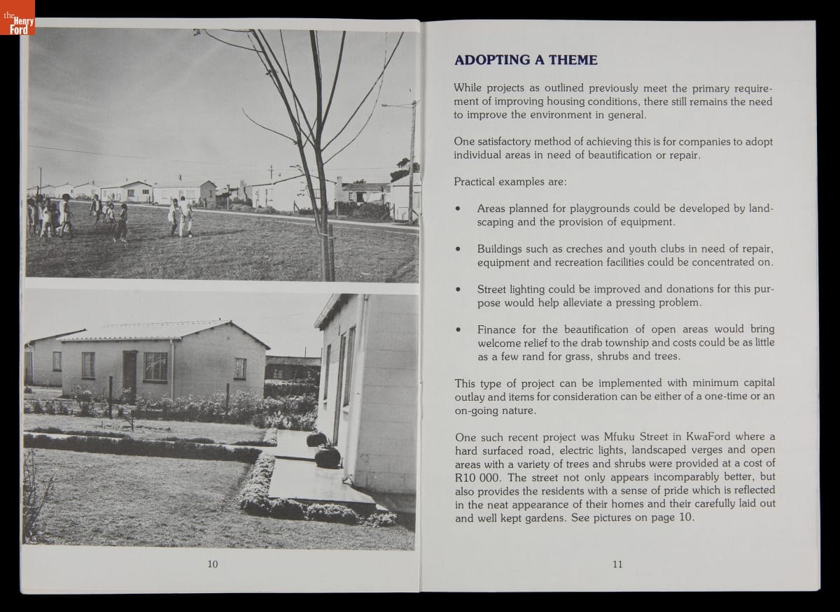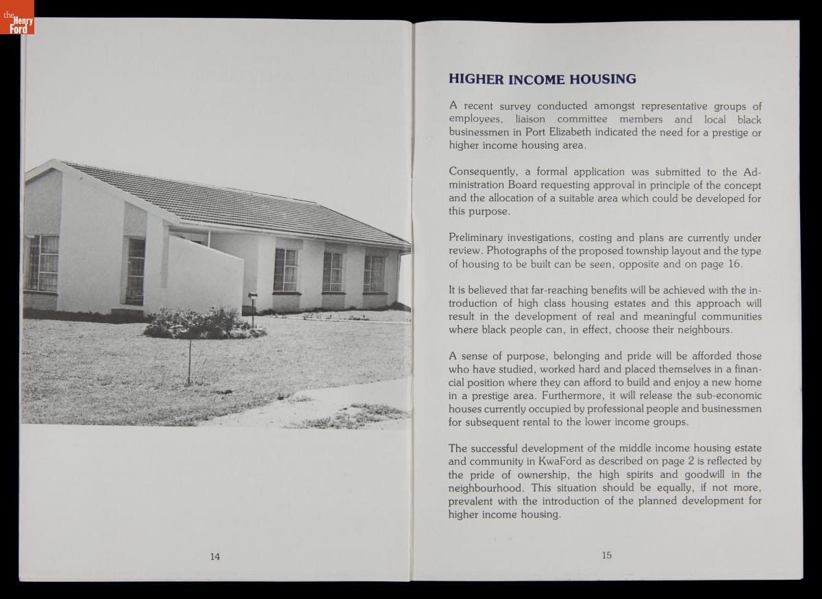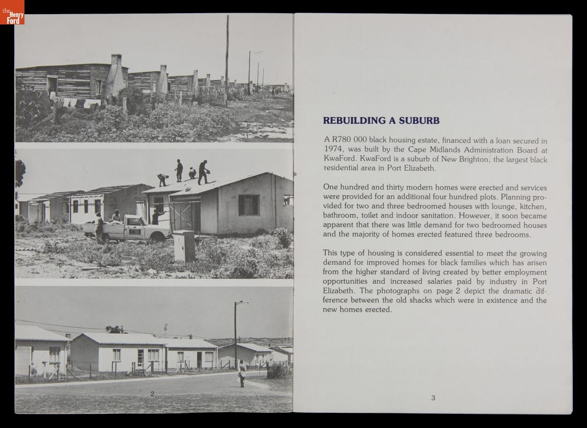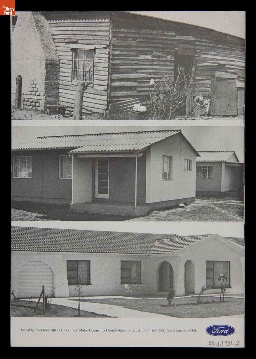 In the 1970s, U.S. firms doing business in South Africa committed resources to improve the working and living conditions of their nonwhite employees to pressure the minority white-led government to end apartheid -- South Africa's systemized segregation of races. Ford Motor Company outlined its housing efforts in this publication. These policies had little effect on apartheid, which ended in the early 1990s only after strict economic sanctions.