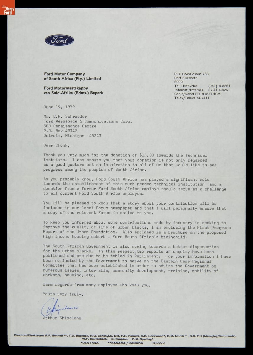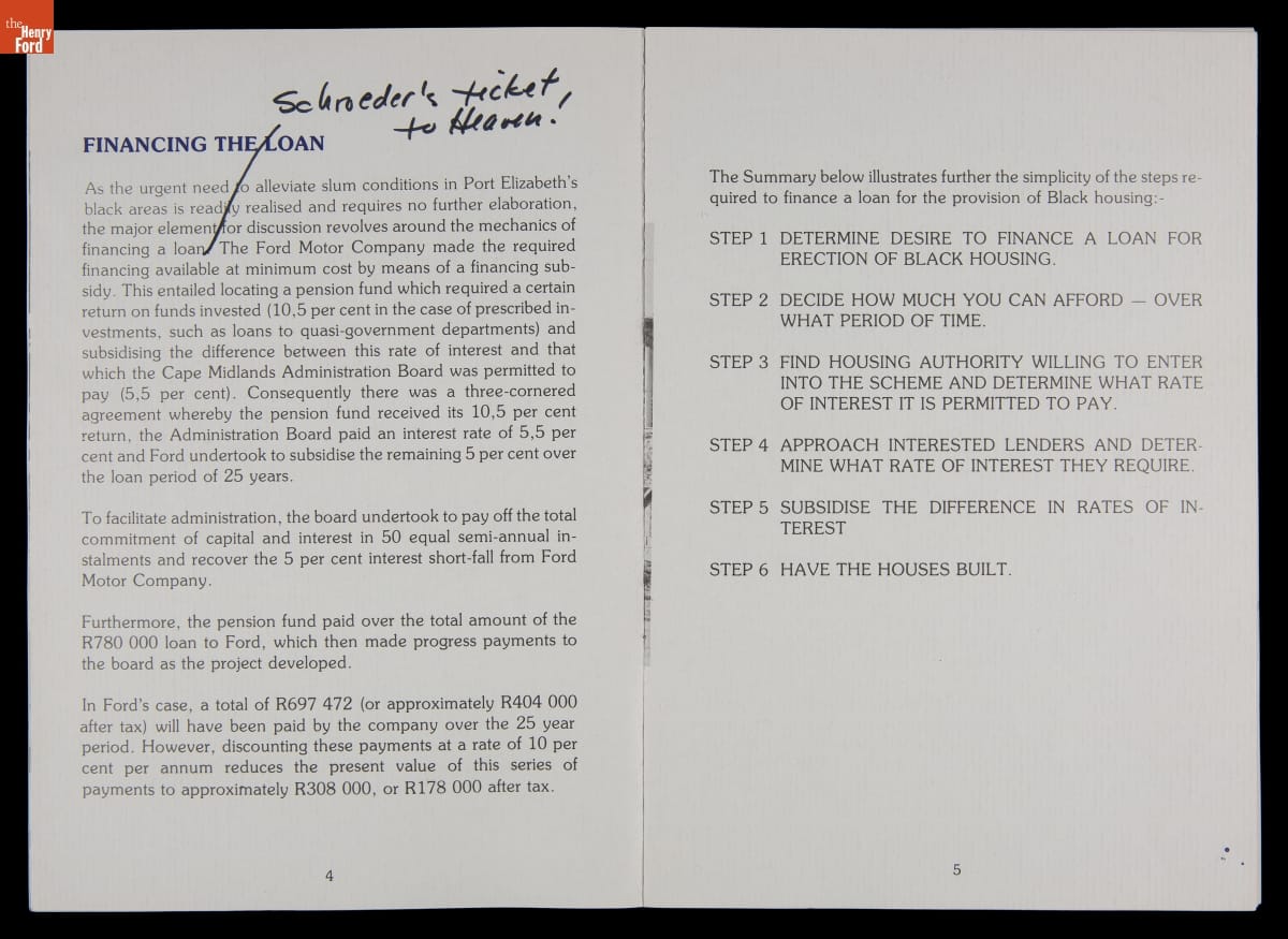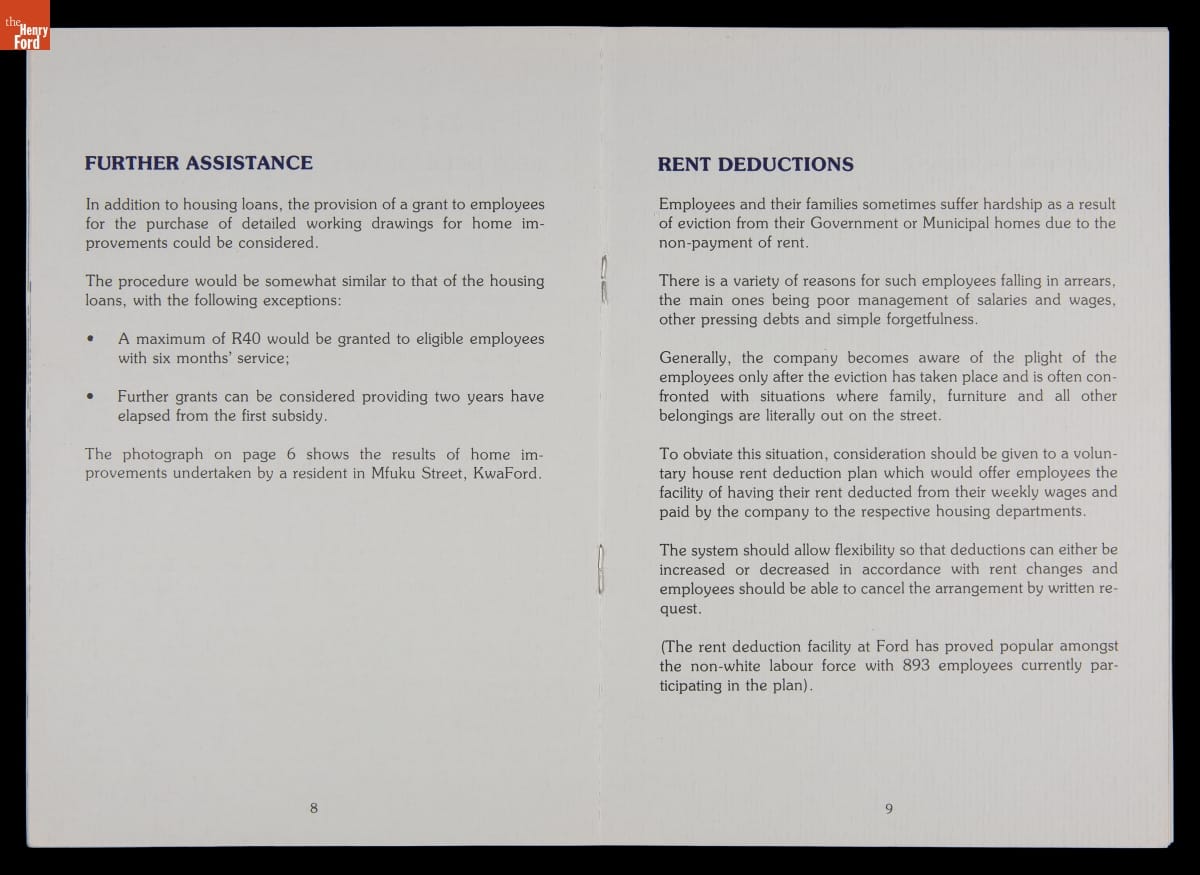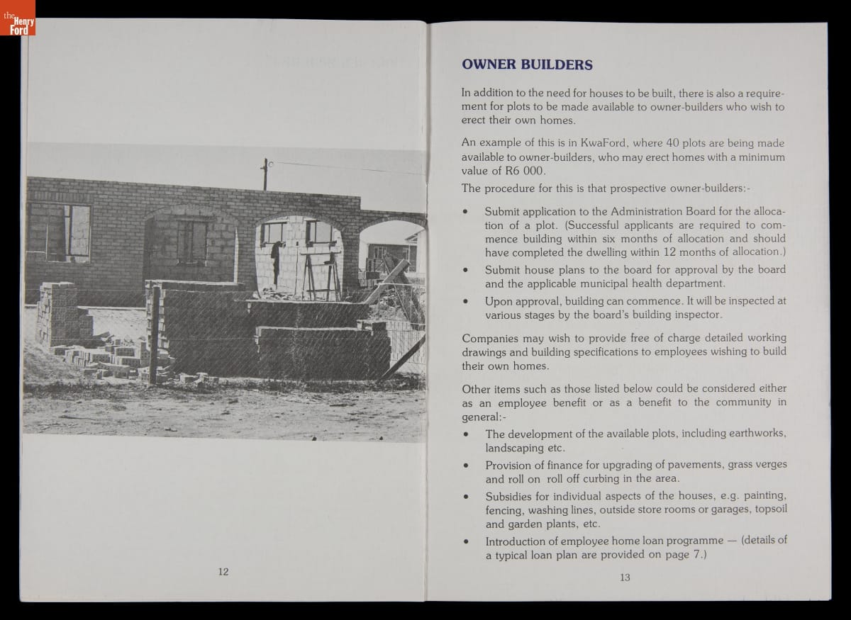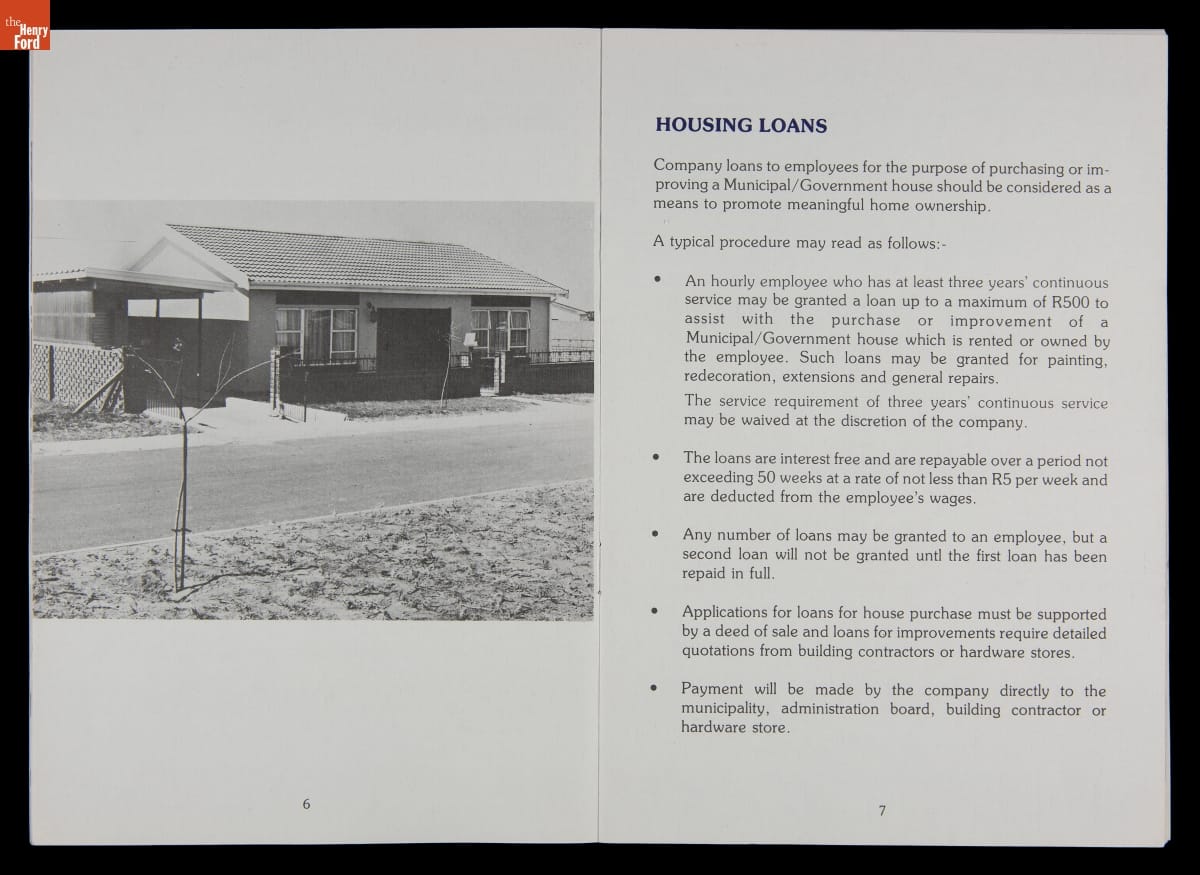 In the 1970s, U.S. firms doing business in South Africa committed resources to improve the working and living conditions of their nonwhite employees to pressure the minority white-led government to end apartheid -- South Africa's systemized segregation of races. Ford Motor Company outlined its housing efforts in this publication. These policies had little effect on apartheid, which ended in the early 1990s only after strict economic sanctions.