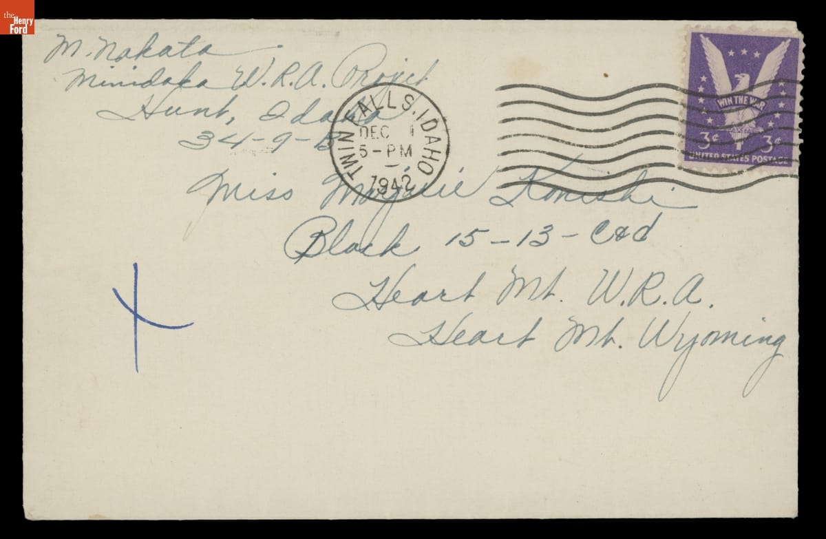 During World War II, the War Relocation Authority removed and unjustly incarcerated more than 120,000 Americans of Japanese ancestry in War Relocation Camps. Entire communities were shipped to one of ten camps in remote areas of the West. Fourteen-year-old Marjorie Konishi, held at the Heart Mountain, Wyoming, camp, received this from M. Nakata, living at Minidoka internment camp in Idaho.