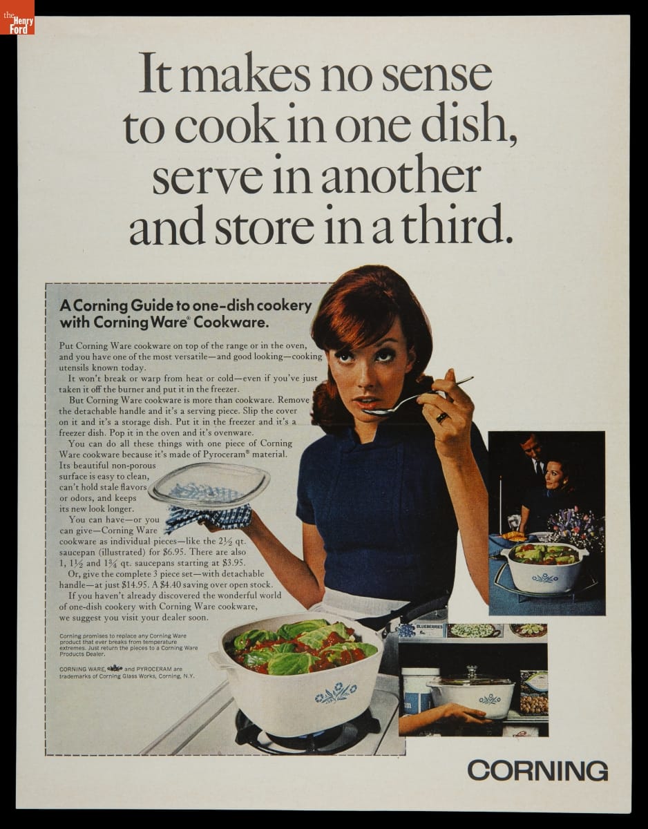 "It Makes No Sense to Cook in One Dish, Serve in Another and Store in a Third," Corning Ware, 1968