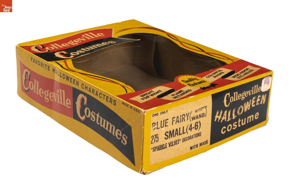 on front of packaging: Collegeville / Costumes / BRIGHT FOR NIGHT / FLAME RETARDED / QUALITY COSTUMES / COLORFUL MASKS / WIDE-VISION EYE HOLES on end of packaging: ONE ONLY / BLUE FAIRY (WITH WAND) / 275 SMALL (4-6) / "SPARKLE VELVET" DECORATIONS / WITH MASK / Collegeville / HALLOWEEN / costume on sticker on end of packaging: HUDSON'S / DETROIT / 665 / 9 - 6 / 2.00 on end of packaging: Collegeville Costumes / COLLEGEVILLE FLAG & MFG.CO. / COLLEGEVILLE, PA. on side of packaging: FAVORITE HALLOWEEN CHARACTERS / Collegeville Costumes on side of packaging: FOR PARTIES - PARADES - TRICK OR TREAT / Collegeville Costumes