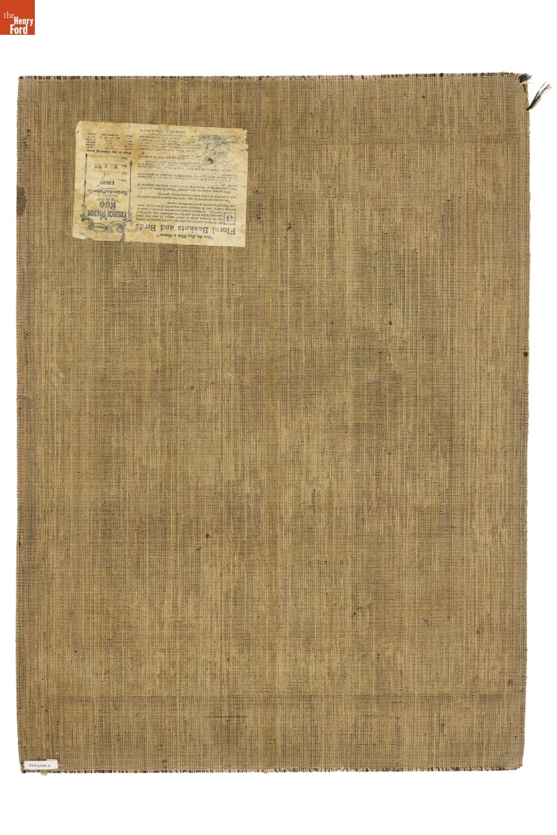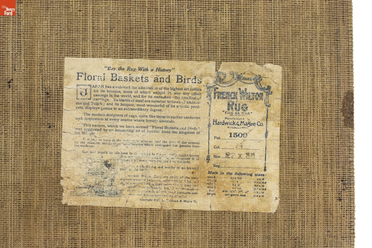 "Buy the Rug With a History" / Floral Baskets and Birds / Japan has awakened the admiration of the highest art critics / for its bronzes, some of which exceed in size any other / carvings. Its blades of steel are superior to [...] / It is easy to trace in the elaborately adorned field the care of the oriental / for the minutest detail--those little touches which distinguish the [...] / French Wilton Rungs are made of the very / choicest worsted yarns and of enduring dyes, and / are of a weave so fine that [...] / FRENCH WILTON / RUG / "FINE AS SILK" / REG. U.S. PAT. OFF. / Manufactured by / Hardwick & Magee Co. / PHILADELPHIA / Pat. 1500 / Col. 14 / Size 27 x 36 / Reg. / Made in the following sizes: / [...]