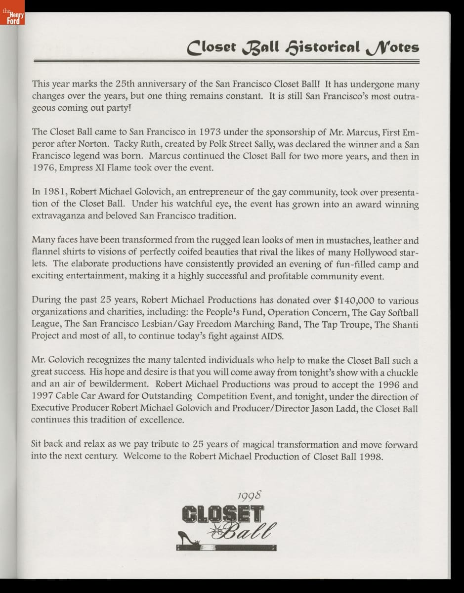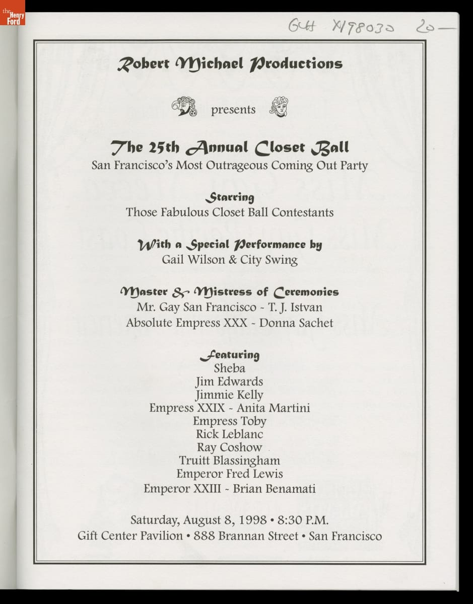 "The 25th Annual Closet Ball: San Francisco's Most Outrageous Coming Out Party," August 8, 1998