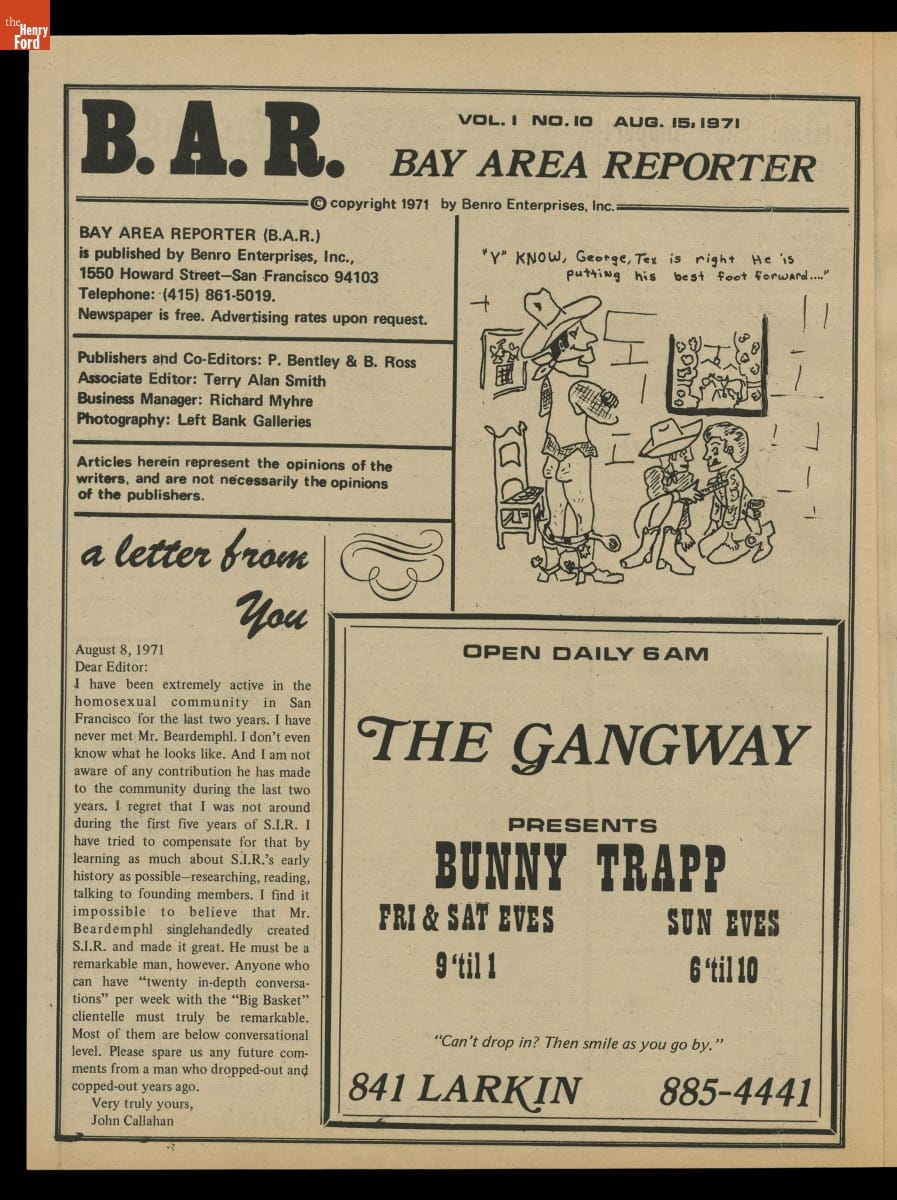 "B.A.R.: Bay Area Reporter," Volume 1, Number 10, August 15, 1971