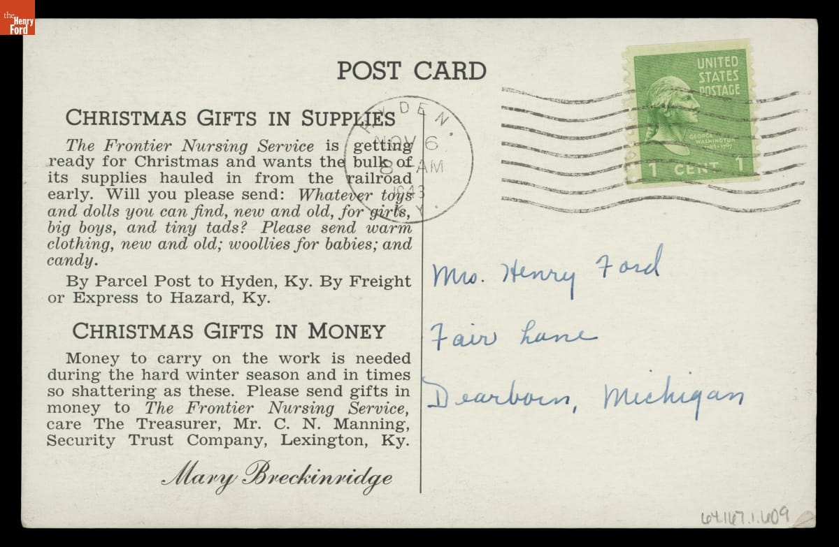 Mary Breckinridge, the daughter of a prominent Southern family, established the Frontier Nursing Service (FNS) in 1925. Breckinridge initially backed the enterprise with her own money, but soon cultivated wealthy individuals, including Clara Ford and her son Edsel, to help support the FNS. Through her philanthropic efforts, Breckinridge brought qualified nurse-midwives and modern, life-saving healthcare to many inaccessible areas of eastern Kentucky.