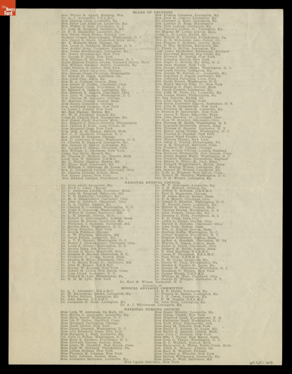 In 1925, Mary Breckinridge established the Frontier Nursing Service to bring qualified nurse-midwives and modern, life-saving healthcare to many inaccessible areas of eastern Kentucky. To support these efforts, Breckinridge cultivated wealthy donors like Clara Ford. In addition to regular financial contributions, Ford funded a nursing center and arranged the donation of several vehicles to help Frontier Nursing Service staff navigate mountainous terrain.