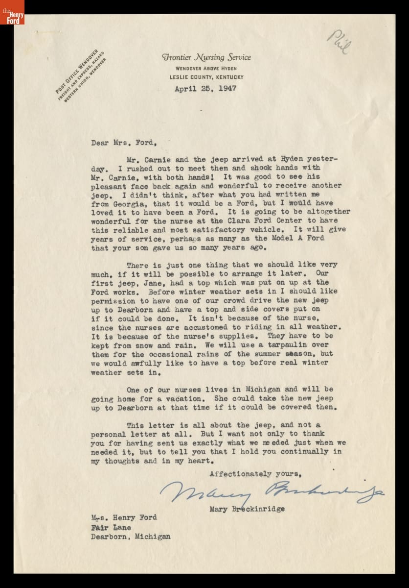 In 1925, Mary Breckinridge established the Frontier Nursing Service to bring qualified nurse-midwives and modern, life-saving healthcare to many inaccessible areas of eastern Kentucky. To support these efforts, Breckinridge cultivated wealthy donors like Clara Ford. In addition to regular financial contributions, Ford funded a nursing center and arranged the donation of several vehicles to help Frontier Nursing Service staff navigate mountainous terrain.