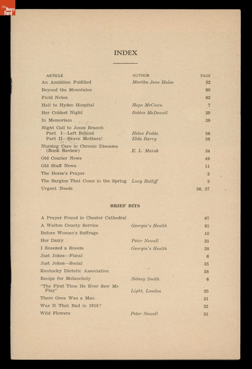 Mary Breckinridge, the daughter of a prominent Southern family, established the Frontier Nursing Service (FNS) in 1925. Breckinridge initially backed the enterprise with her own money, but soon cultivated wealthy individuals, including Clara Ford and her son Edsel, to help support the FNS. Through her philanthropic efforts, Breckinridge brought qualified nurse-midwives and modern, life-saving healthcare to many inaccessible areas of eastern Kentucky.