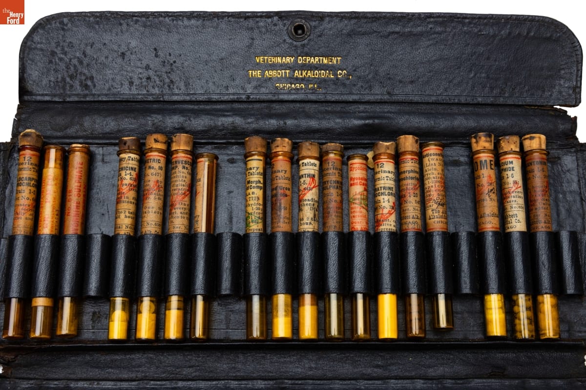 Chicago-based Abbott Alkaloidal Company, now Abbot Laboratories, sold cases filled with vials of medicines needed by doctors and veterinarians in their practices. This case contains drugs made by Abbott and other well-known pharmaceutical firms. Dr. F. Eugene Eads, who once headed the veterinary department at Parke, Davis and Company, owned this case.