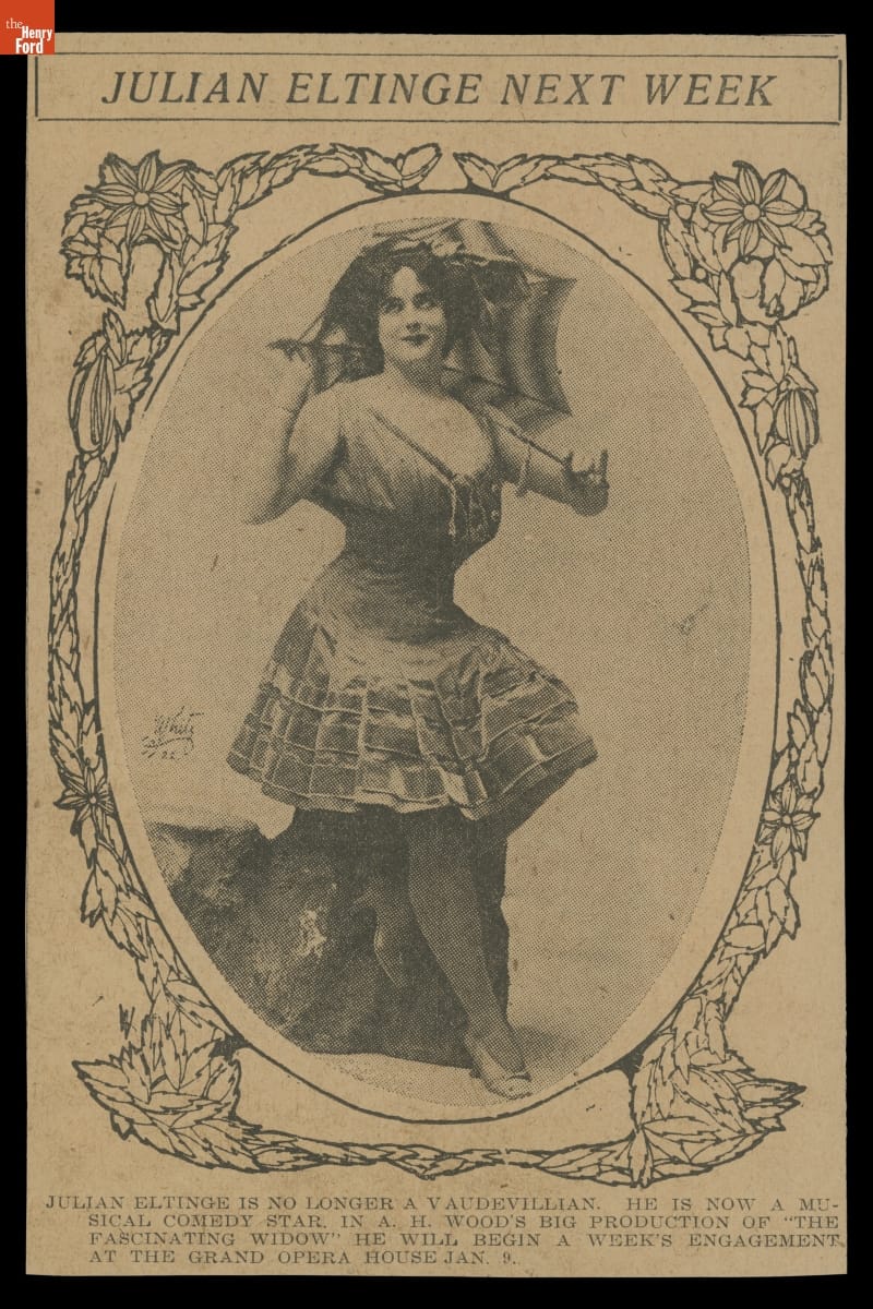 Vaudeville performer Julian Eltinge was the most famous and highly paid female impersonator of the early 20th century. He embodied gaudy elegance, wore glamourous gowns, and perfected female mannerisms. His most well-known show -- The Fascinating Widow -- opened on Broadway in 1910. He would go on to appear in several Hollywood films, in addition to his continued stage performances.